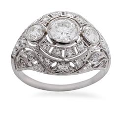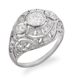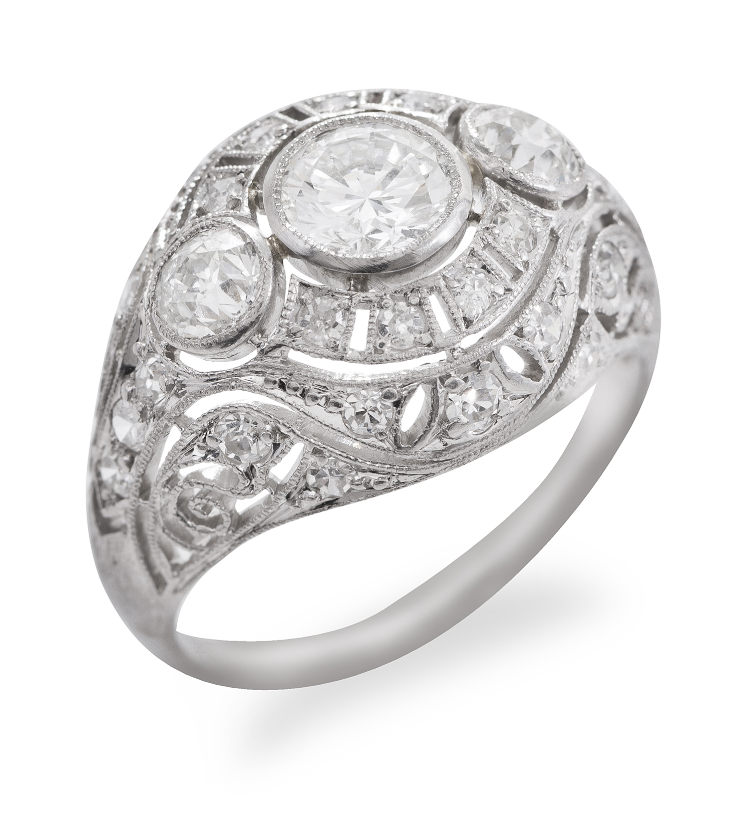 The domed pierced frame centrally set with a round brilliant cut diamond of 0.80cts offset by two further diamonds totalling 0.58cts with further diamond detail throughout to the filigree setting, all hand crafted and mounted in platinum, ring size N.