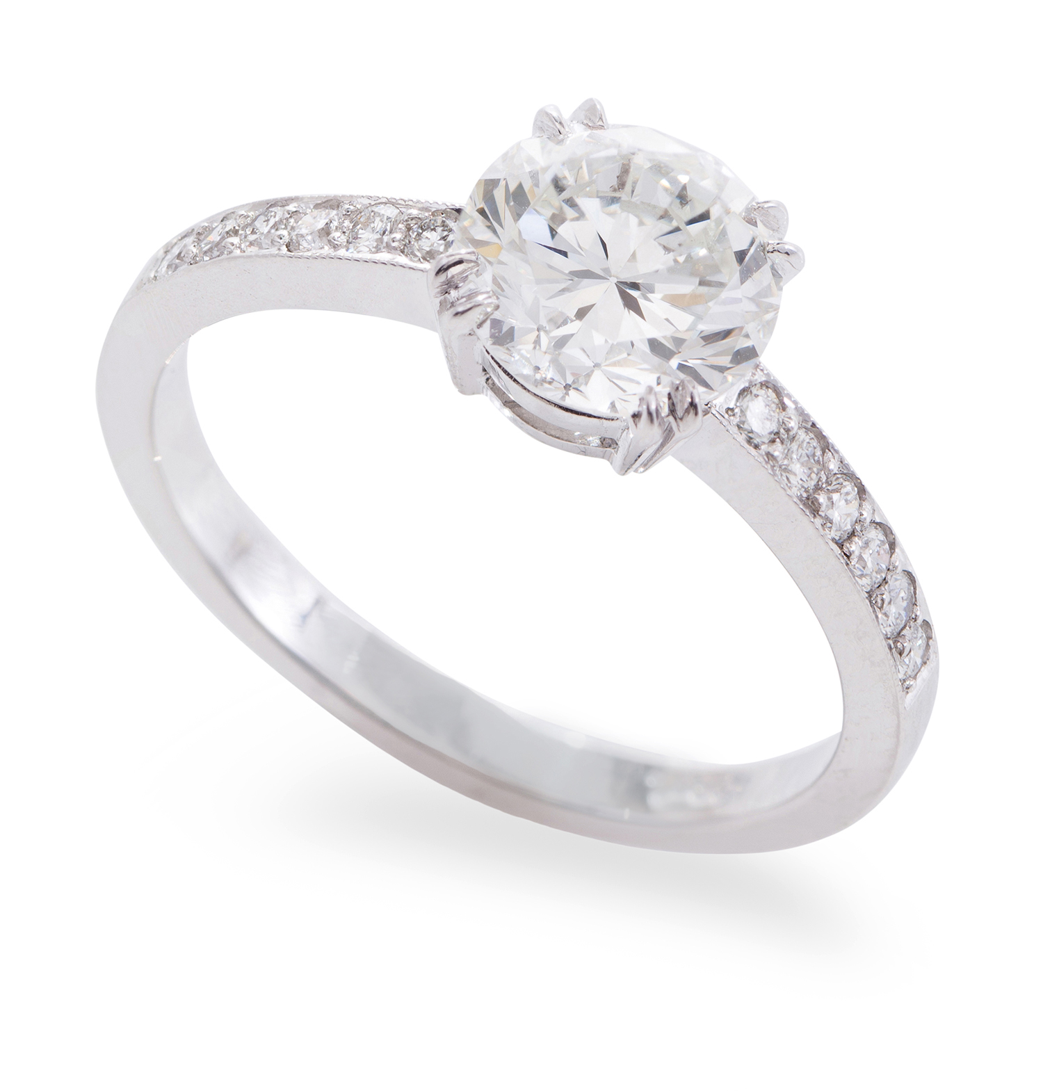 The round brilliant cut diamond of 1.46cts raised in four double claws with further diamonds to the shoulders, mounted in 18ct white gold, ring size N.