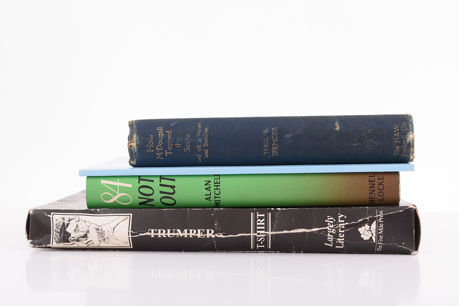 VICTOR TRUMPER: FOUR COLLECTABLES - "HOW MCDOUGALL TOPPED THE SCORE" BY THOS SPENCER; MCC TOUR AUSTRALIA 1903-04 BY R.CARDWELL (SIGNED O'REILLY); "84 NOT OUT" ; TRUMPER T-SHIRT.