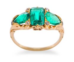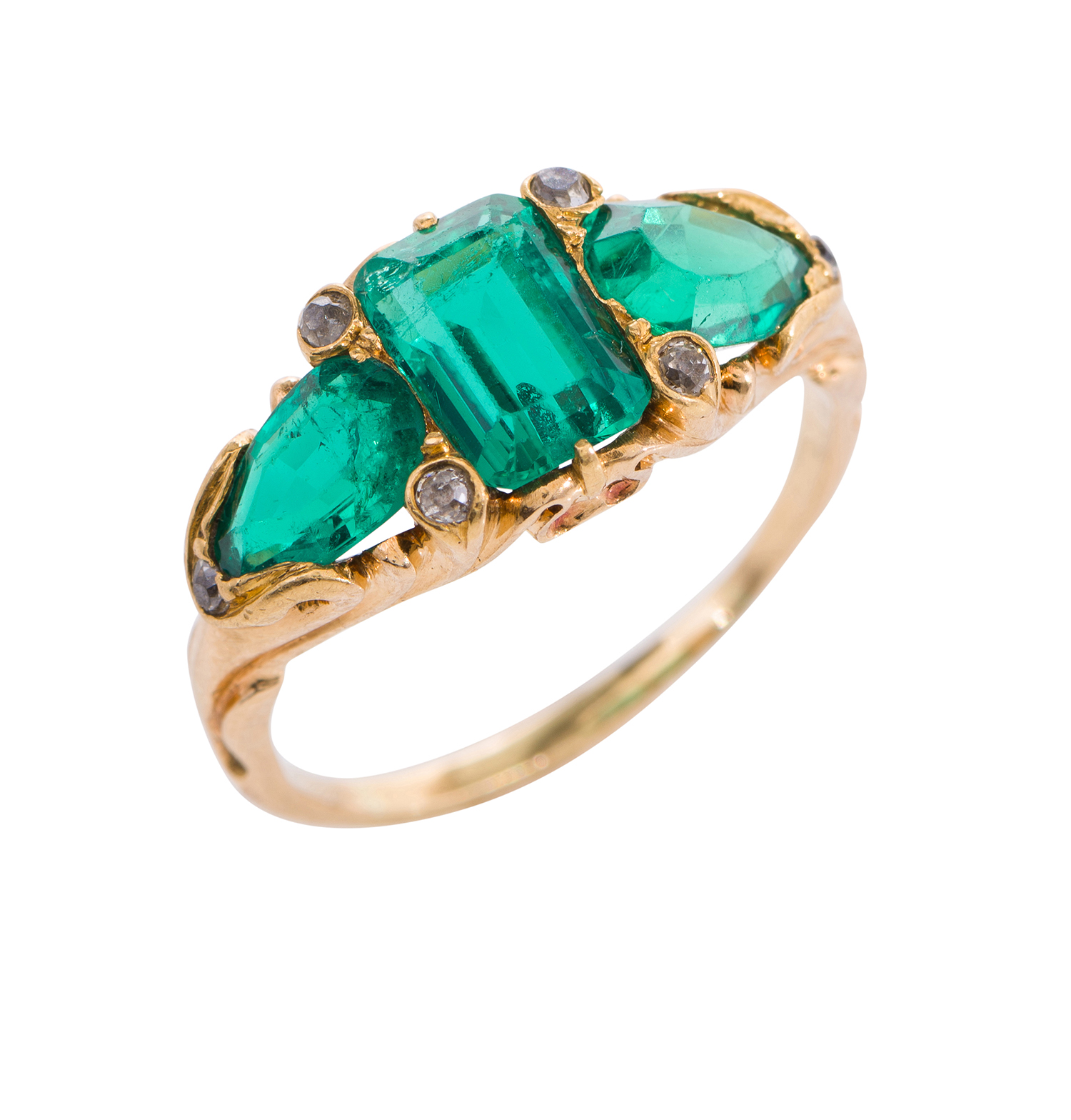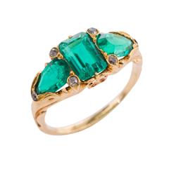 The centrally set emerald cut emerald of 1.08cts, flanked by pear shaped emeralds totalling 1.05cts, finished with four small old cut diamonds, fine crafted in 18ct gold, ring size M.