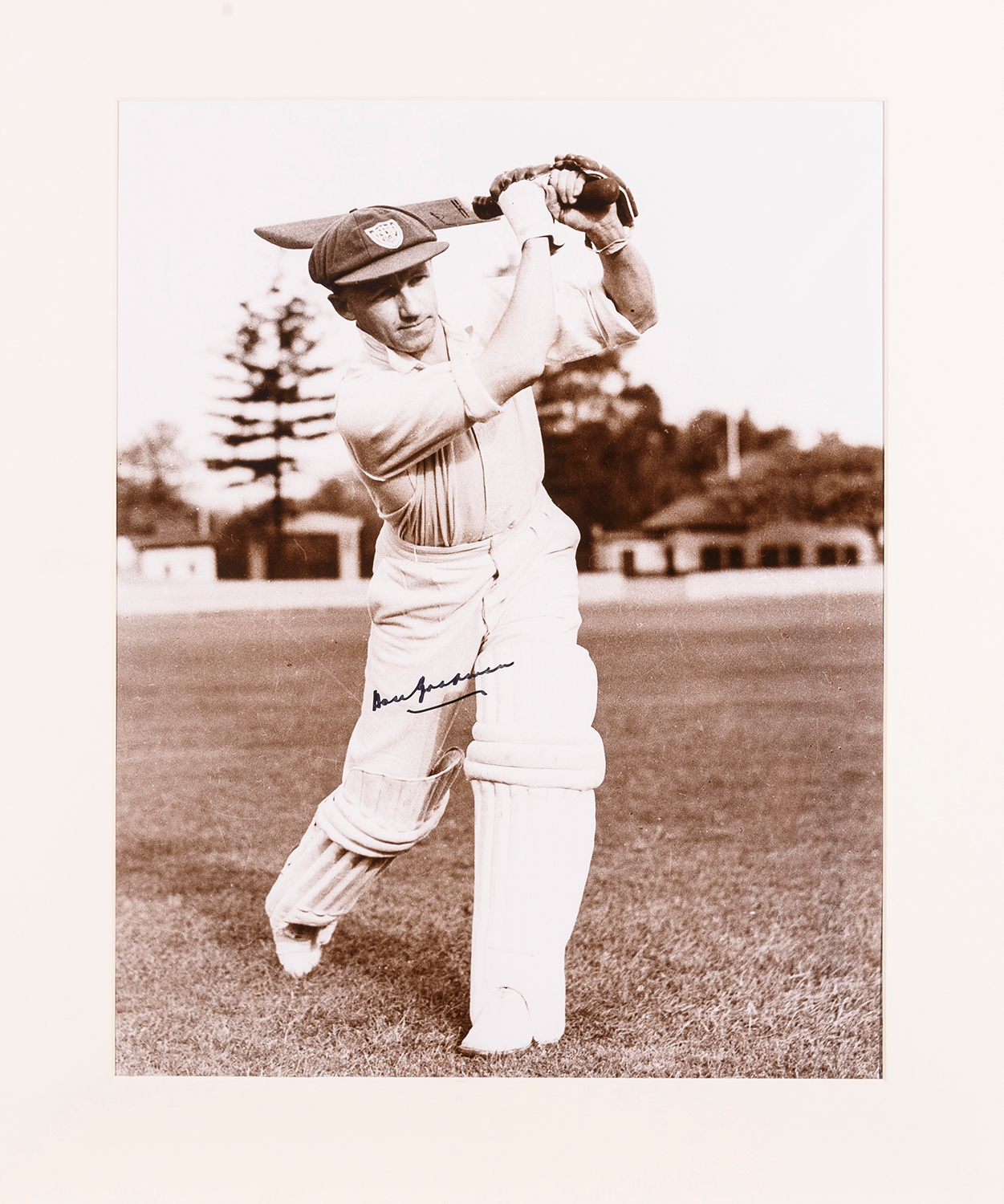 DON BRADMAN, SIGNATURE ON LARGE PHOTOGRAPH OF BRADMAN'S STRAIGHT DRIVE, 41 X 51 CM.