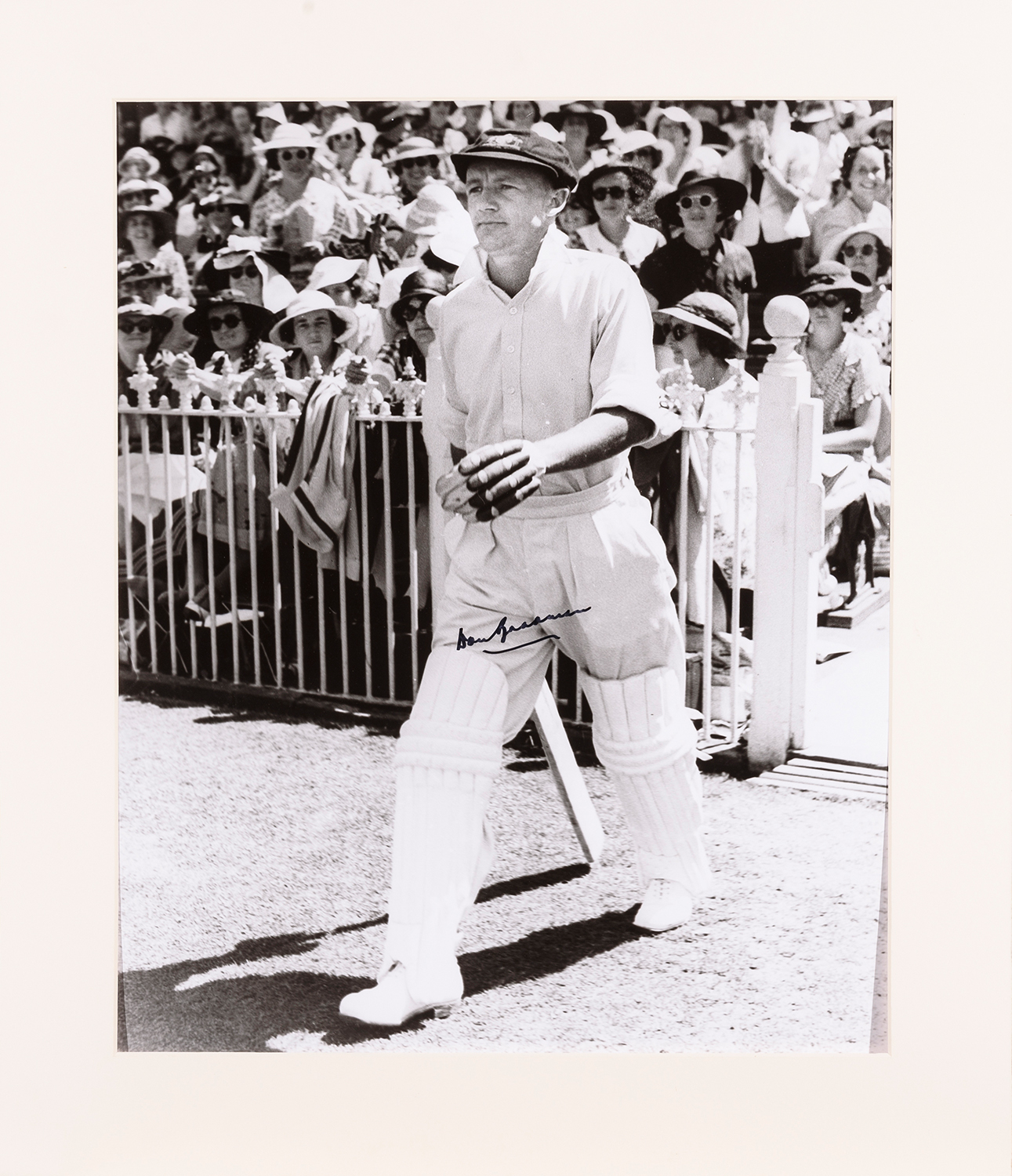 DON BRADMAN, SIGNATURE ON LARGE PHOTOGRAPH OF BRADMAN WALKING OUT TO BAT AT THE MCG DURING HIS INNINGS OF 270 IN 3RD TEST V ENGLAND 1936-37, 41 X 51 CM.