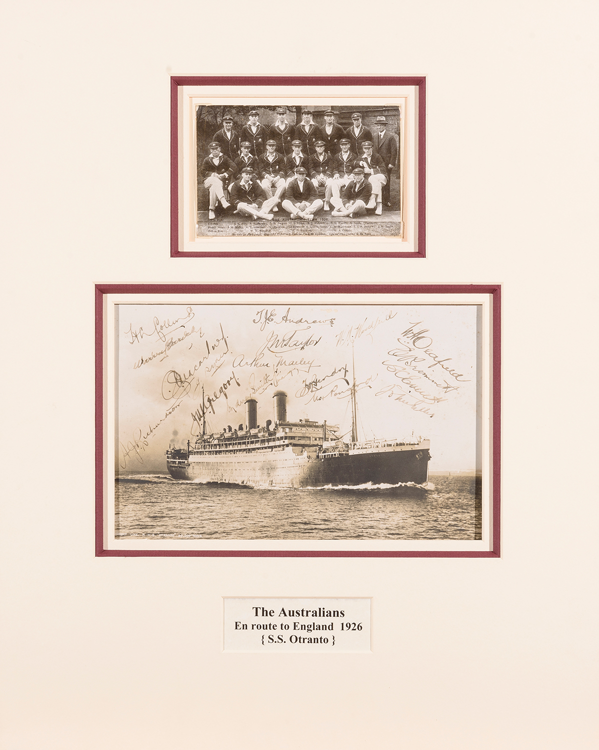 1926 AUSTRALIAN TOUR TO ENGLAND: DISPLAY WITH PHOTOGRAPH OF ORIENT LINE R.M.S. "OTRANTO" SIGNED BY THE AUSTRALIAN TEAM, 17 SIGNATURES INCLUDING HERBERT COLLINS (CAPTAIN), WARREN BARDSLEY, BILL PONSFORD & CLARRIE GRIMMETT, WINDOW MOUNTED WITH POST CARD "THE AUSTRALIAN TEAM 1926" OVERALL 41 X 51CM