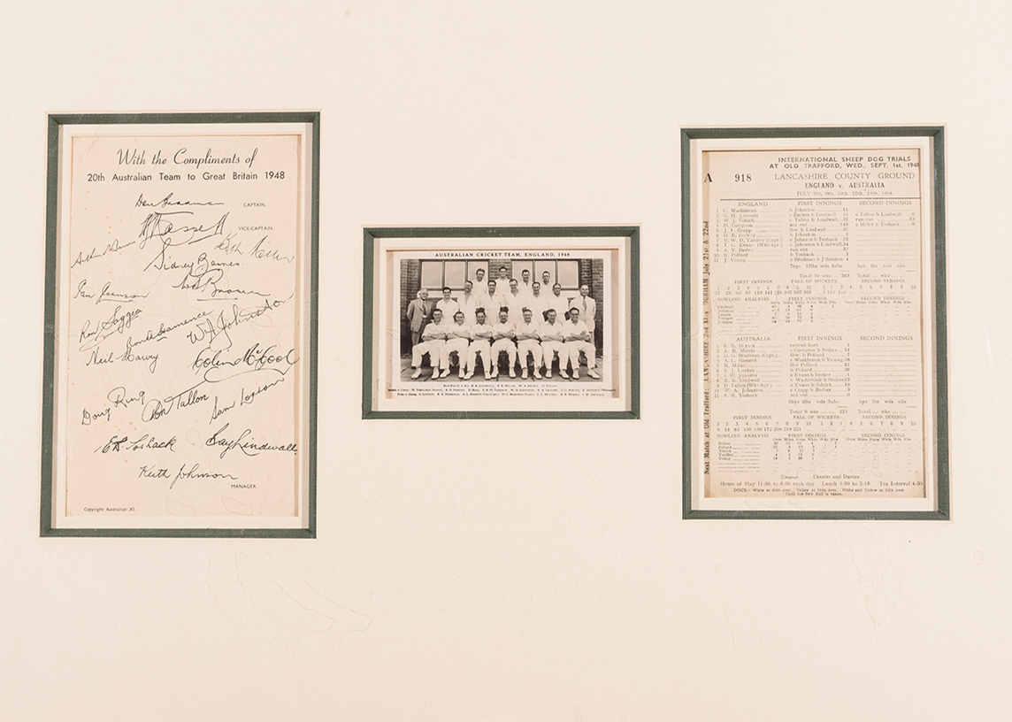 1948 AUSTRALIAN TOUR TO ENGLAND: DISPLAY COMPRISING OF AUSTRALIAN TEAM SHEET WITH FACSIMILE AUTOGRAPHS; WINDOW MOUNTED WITH POSTCARD "AUSTRALIAN CRICKET TEAM, ENGLAND, 1948" & ORIGINAL SCORE CARD FOR THIRD TEST AT OLD TRAFFORD. OVERALL 61 X 51CM