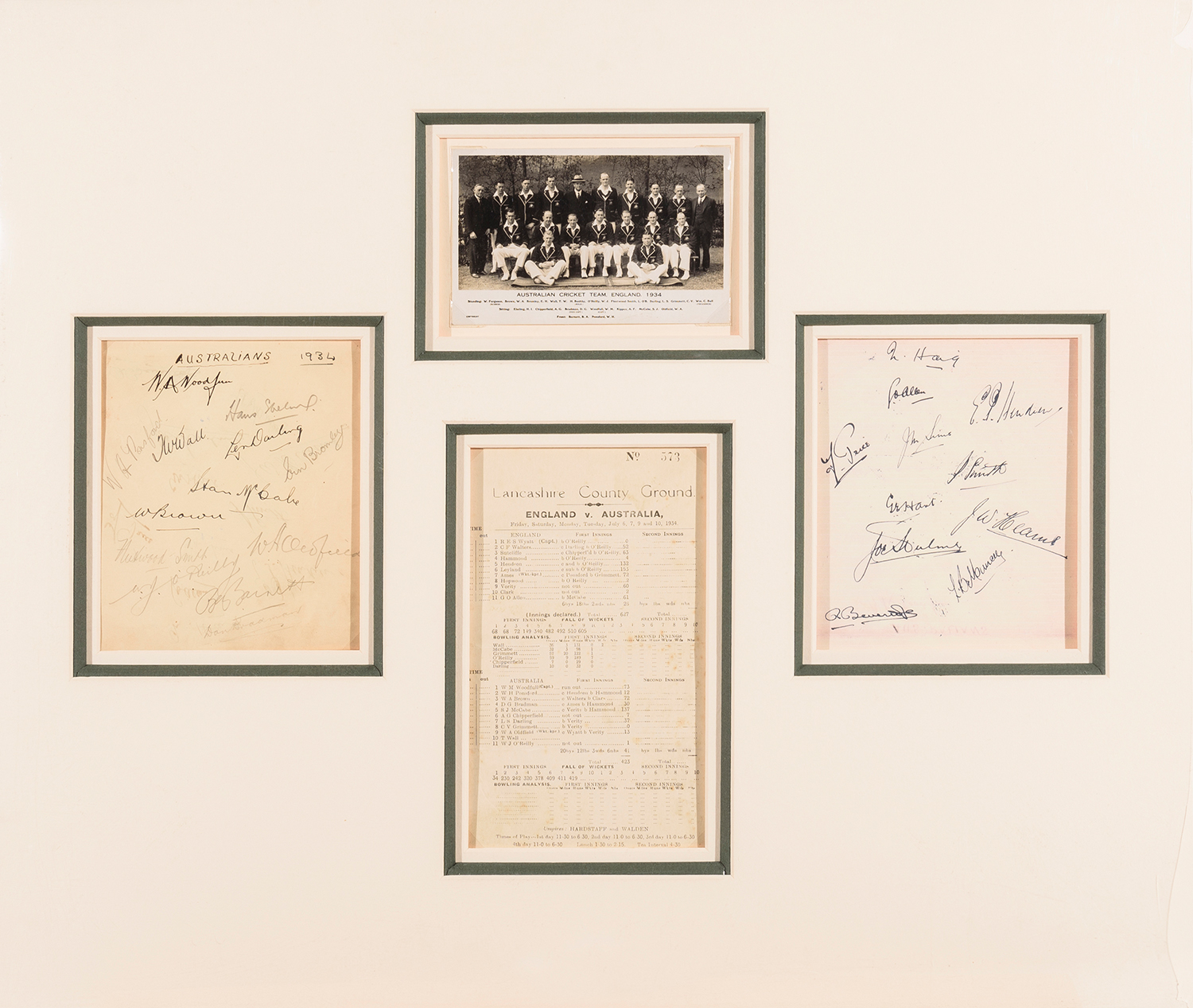 1934 AUSTRALIAN TOUR TO ENGLAND: DISPLAY COMPRISING AUTOGRAPH PAGE SIGNED BY AUSTRALIAN TEAM 13 SIGNATURES INCLUDING DON BRADMAN, BILL WOODFULL & BILL BROWN; COPY OF REVERSE SHOWING ENGLAND TEAM SIGNATURES; POSTCARD "AUSTRALIAN CRICKET TEAM, ENGLAND, 1934"; PLUS ORIGINAL SCORE CARD FOR THIRD TEST. OVERALL 61 X 51CM