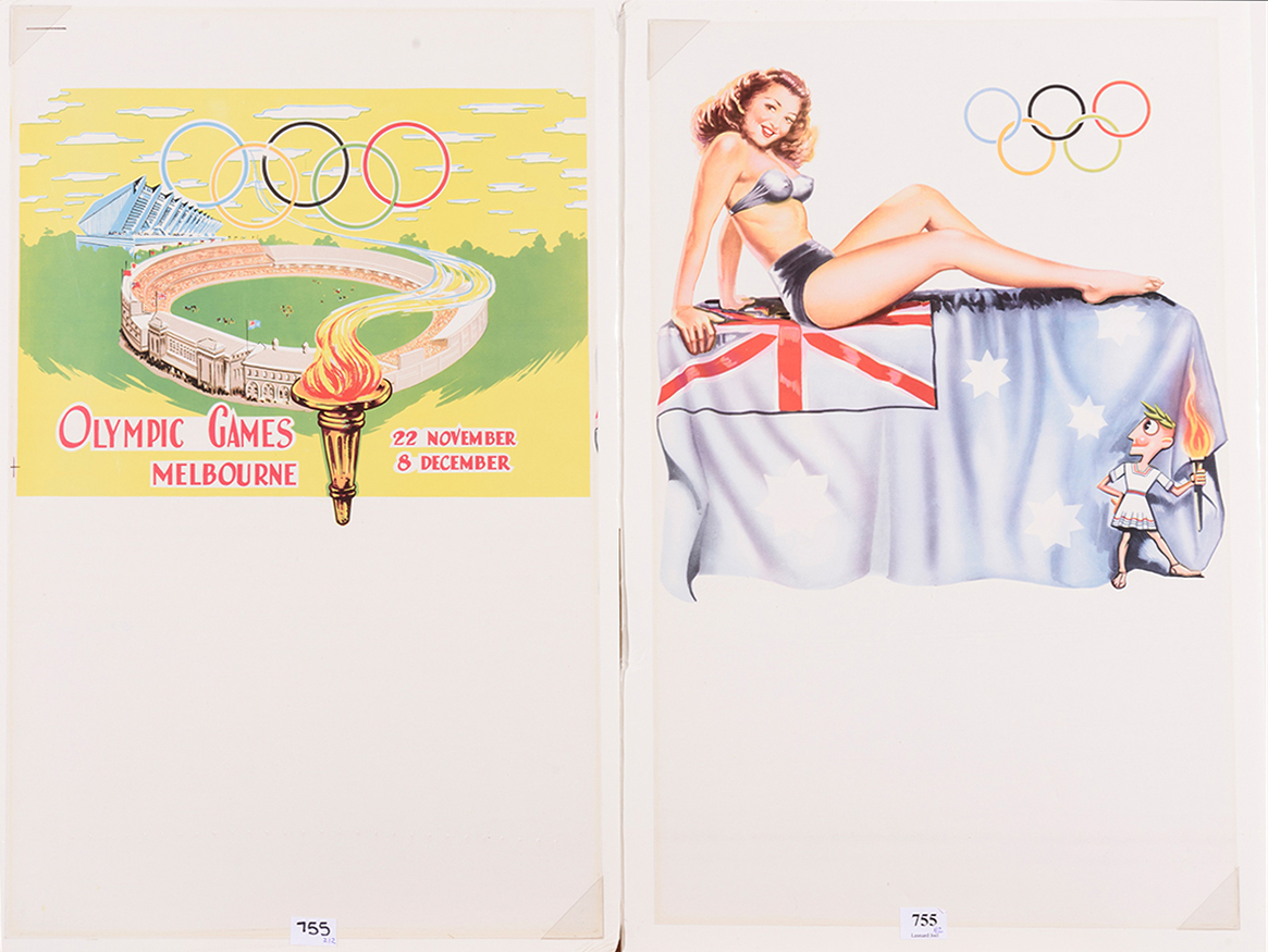 1956 MELBOURNE OLYMPICS: PAIR OF CALENDAR BLANKS, ONE SHOWING MCG, OTHER SHOWING PIN UP GIRL, EACH 31 X 50CM