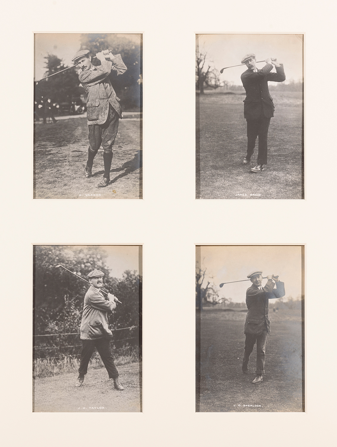 ORIGINAL PHOTOGRAPHS (4) OF FAMOUS GOLFERS, H.VARDON, JAMES BRAID, J.H.TAYLOR, J.G.SHERLOCK. WINDOW MOUNTED TOGETHER, OVERALL 41 X 51CM