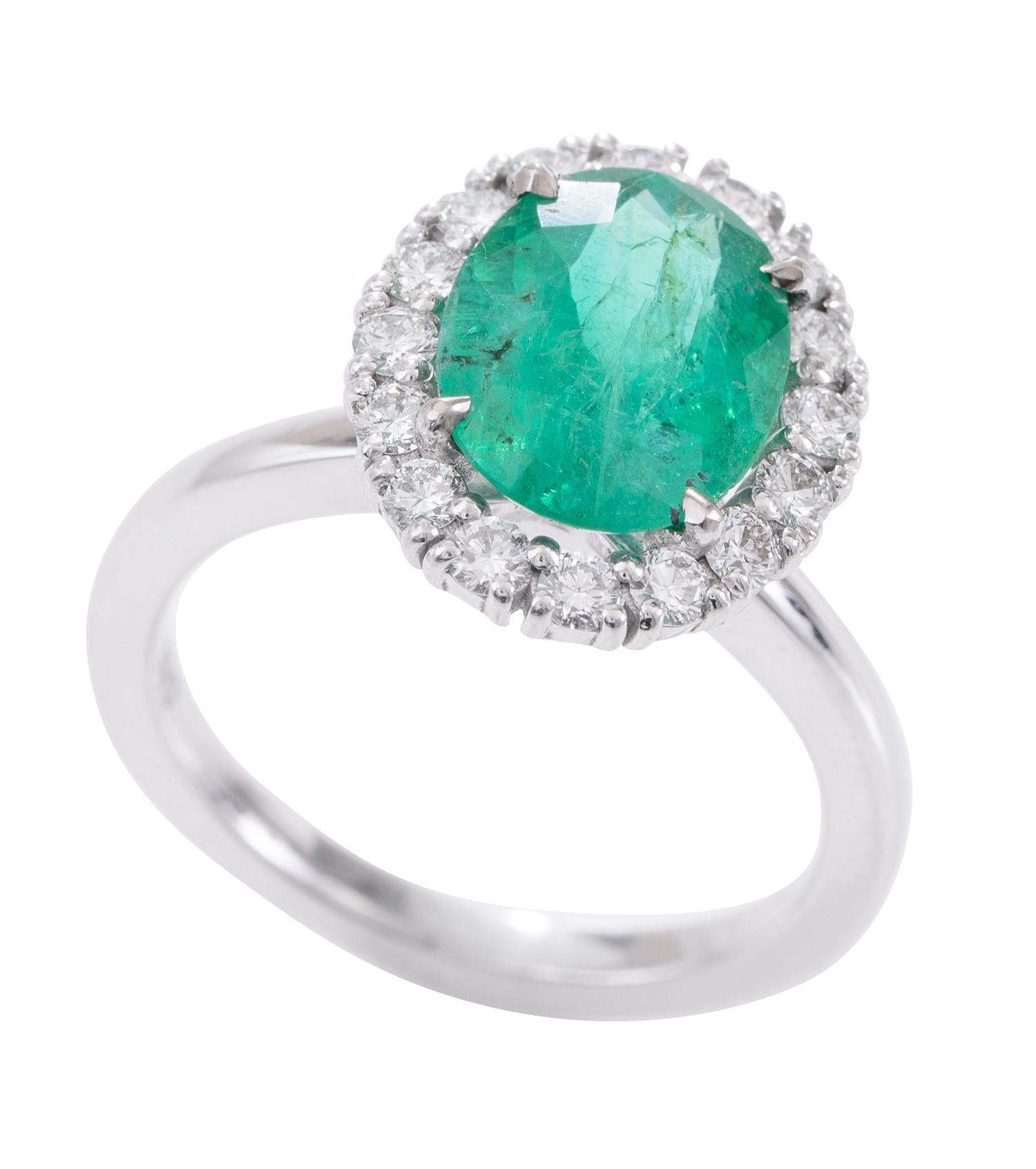 Centrally set with an oval faceted emerald of 2.64cts, within a border of round brilliant cut diamonds, mounted in 18ct white gold, ring size N.