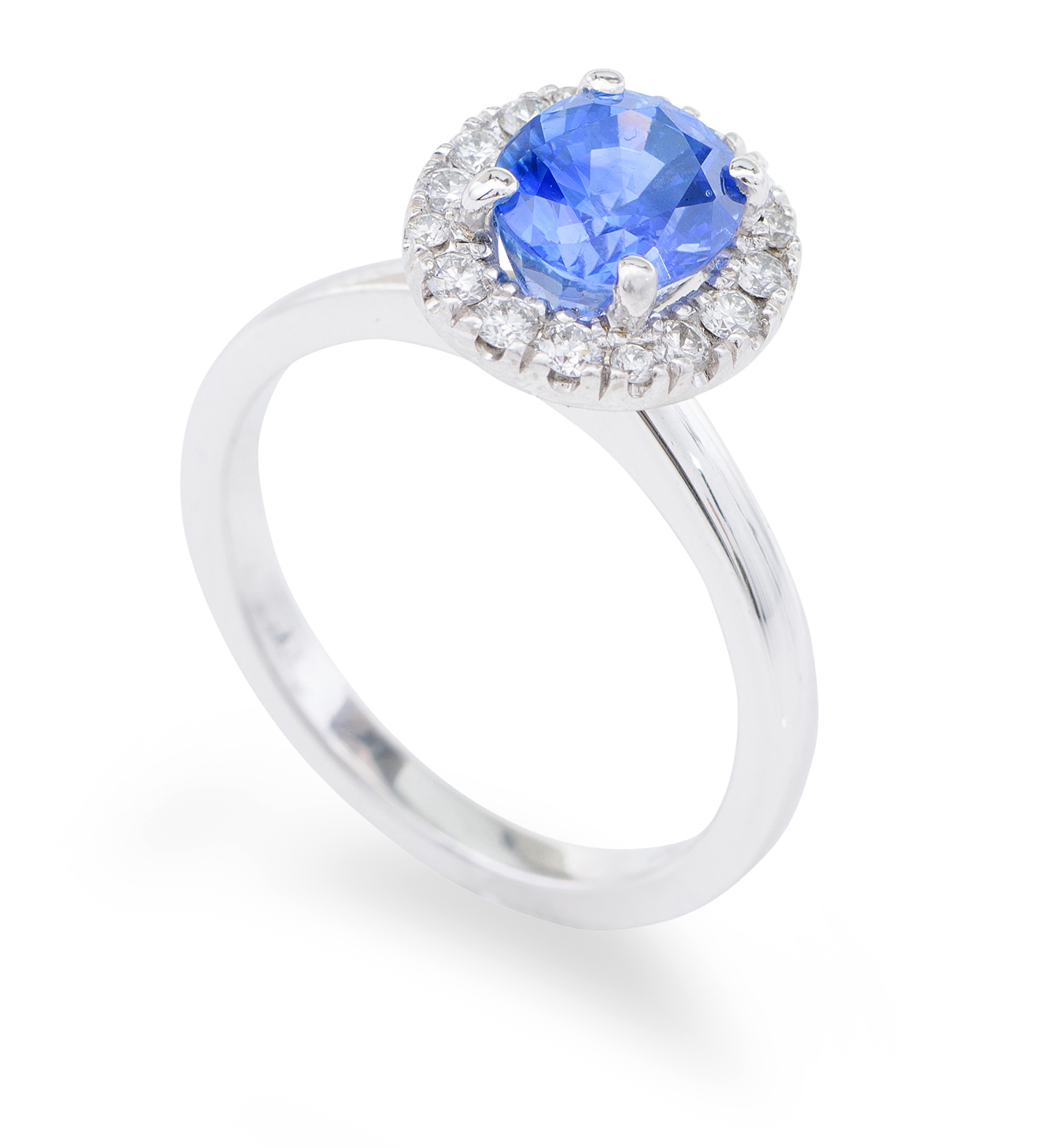 Centrally set with an oval faceted sapphire of 2.30cts, surrounded by round brilliant cut diamonds totalling 0.27cts, mounted in 18ct white gold, ring size O.