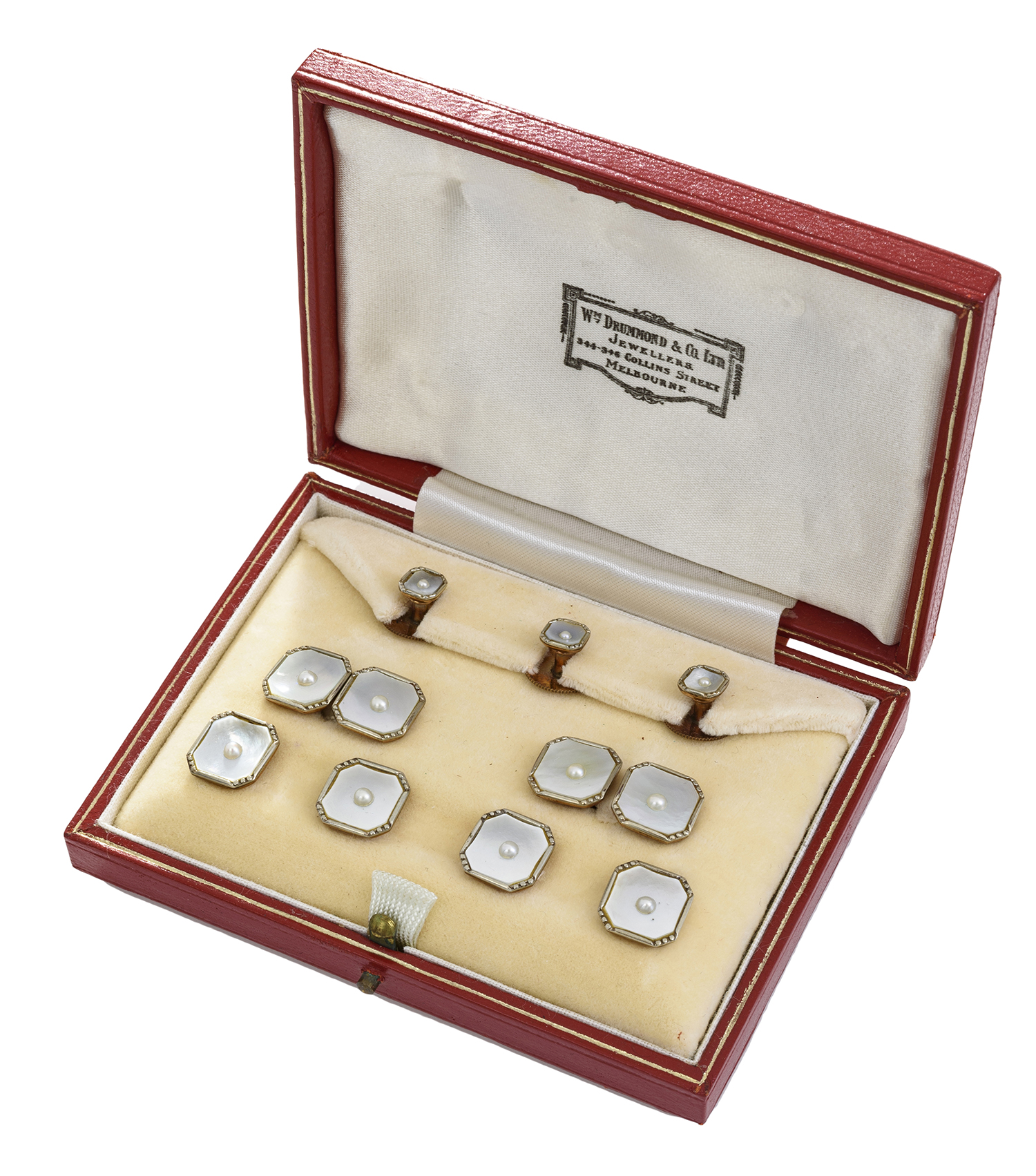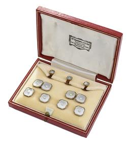 Comprising cufflinks, buttons and shirt studs, all mounted in 9ct gold, retailed by Drummond & Co, boxed.