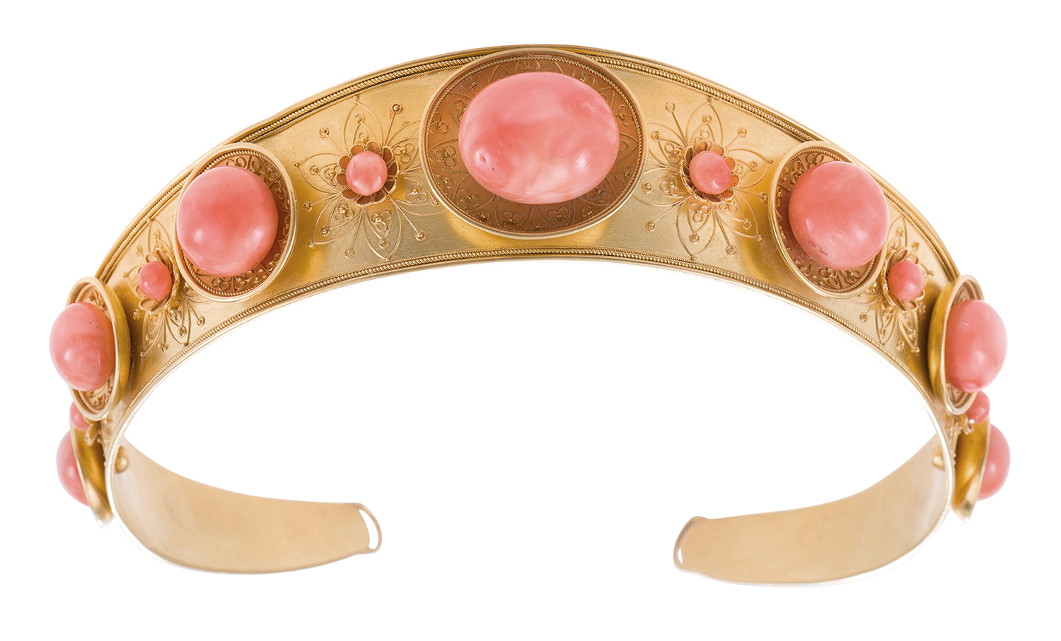 Formed as a tapered semi-circular gold band with rope twist boarders, the oval and round coarllium rubrum cut en cabochon alternatively set within concave discs and floral motifs, the whole decorated with gold wirework, assay marks, height at the tallest point 30mm.