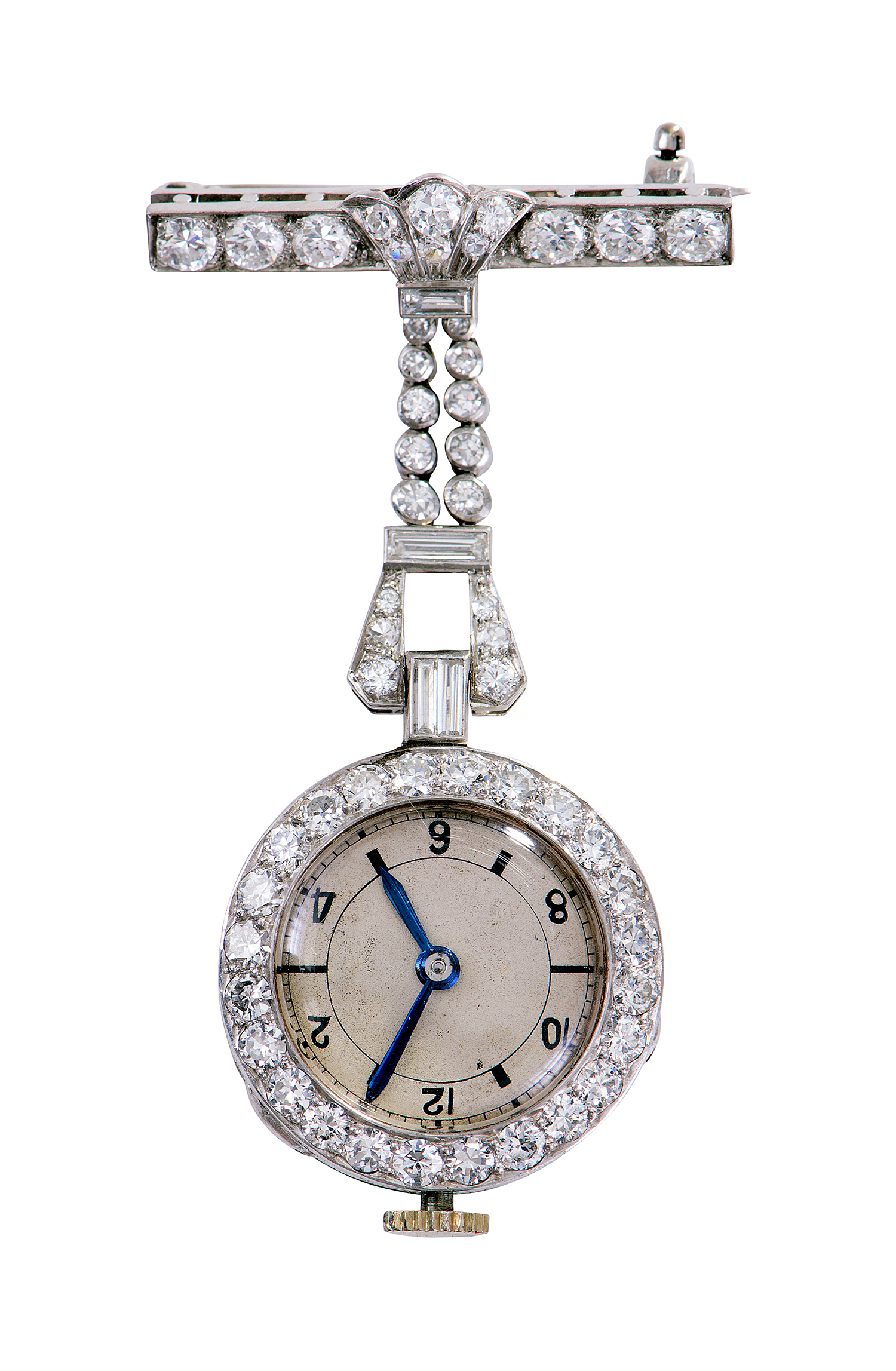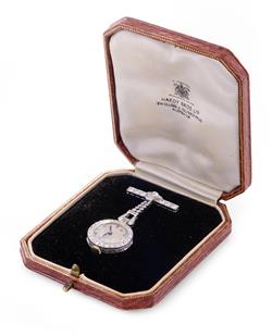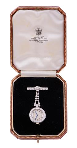 The diamond watch suspended from a diamond set brooch fitting with fleur-de-lys design, mounted in 18ct white gold, presented in original Hardy Brothers fitted box.
