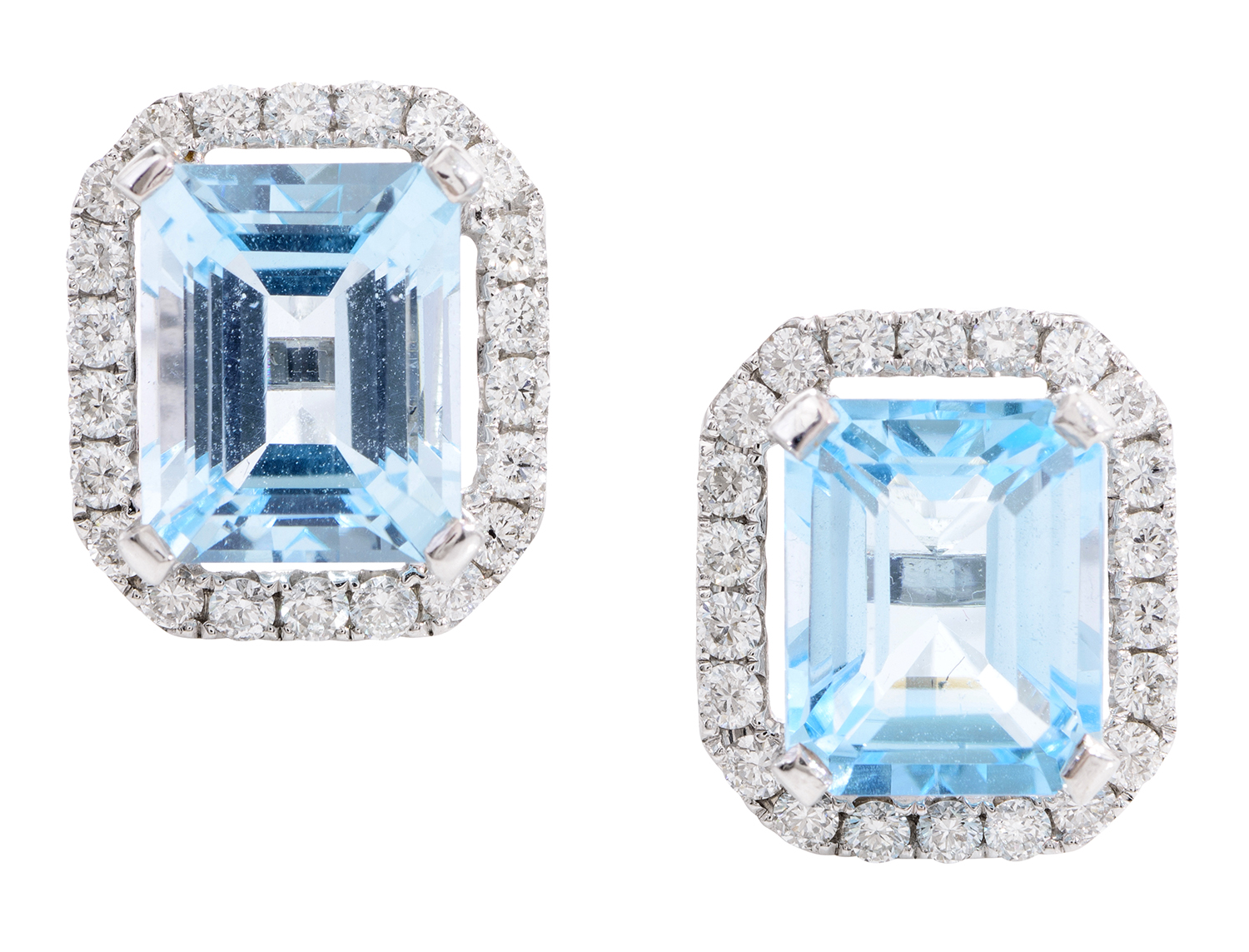 Each comprising an emerald cut aquamarine, surrounded by round brilliant cut diamonds, mounted in 18ct white gold.