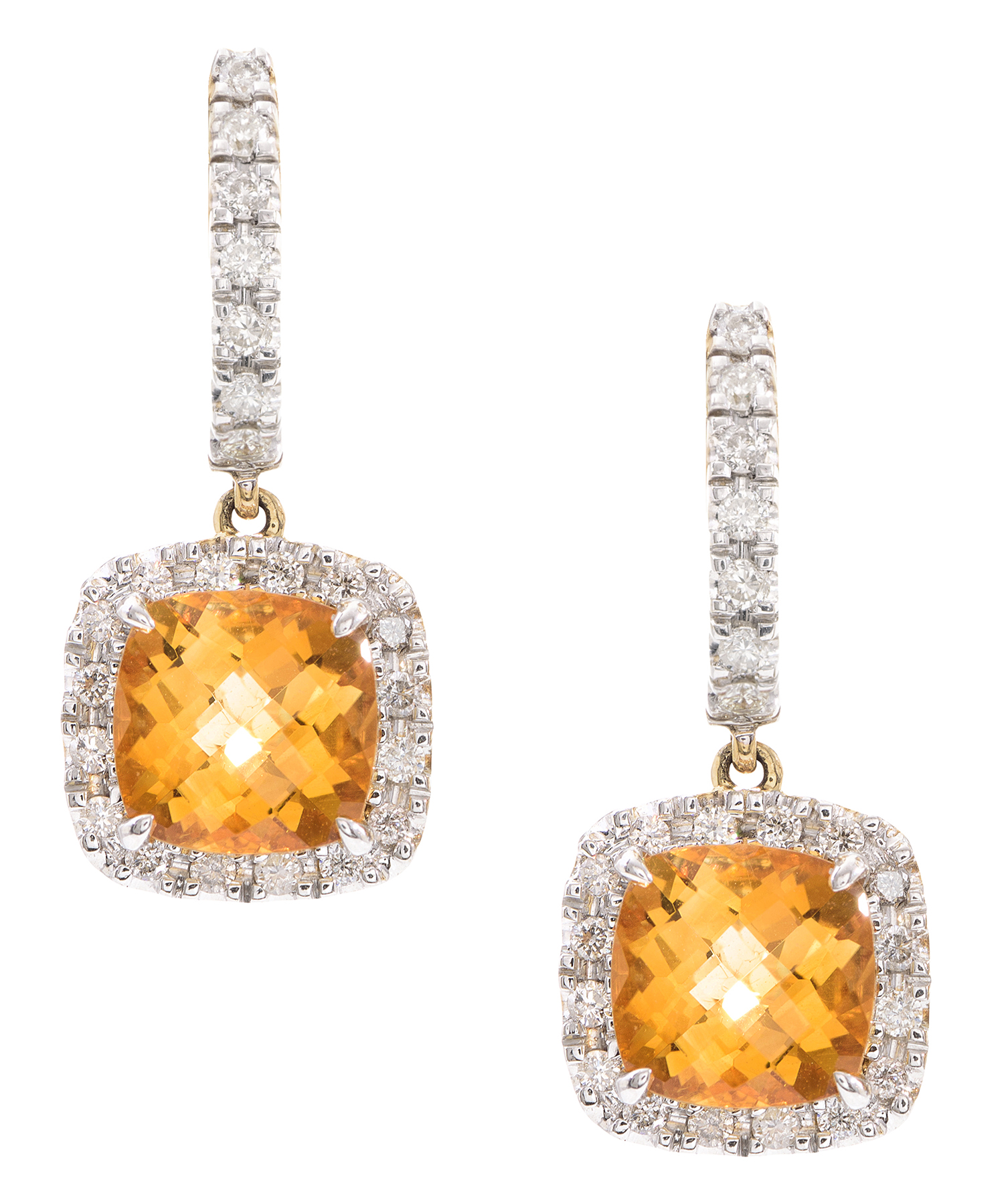 A PAIR OF CITRINE AND DIAMOND DROP EARRINGS