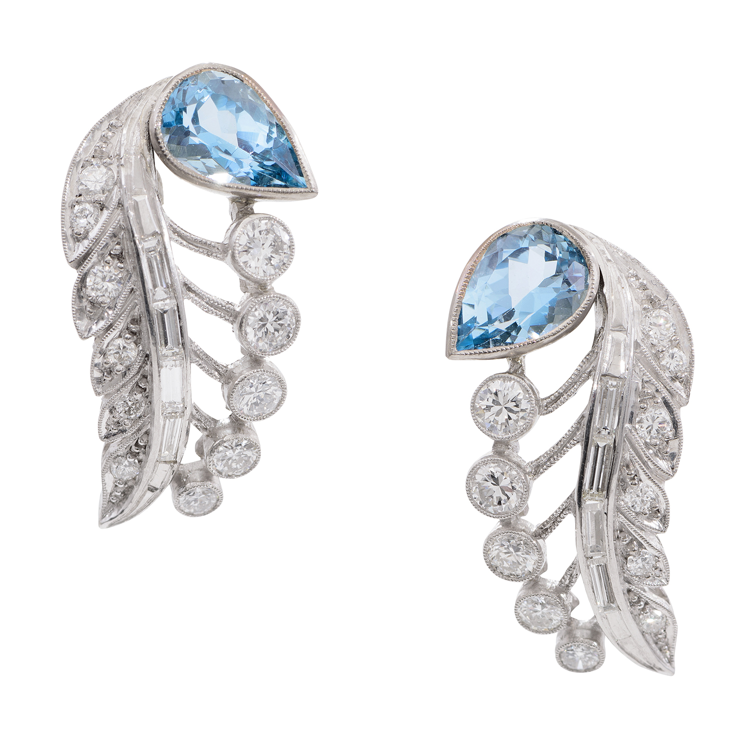 Each modelled as a stylised leaf, set with a pear cut aquamarine and round brilliant and baguette cut diamonds, mounted in platinum and 18ct white gold.