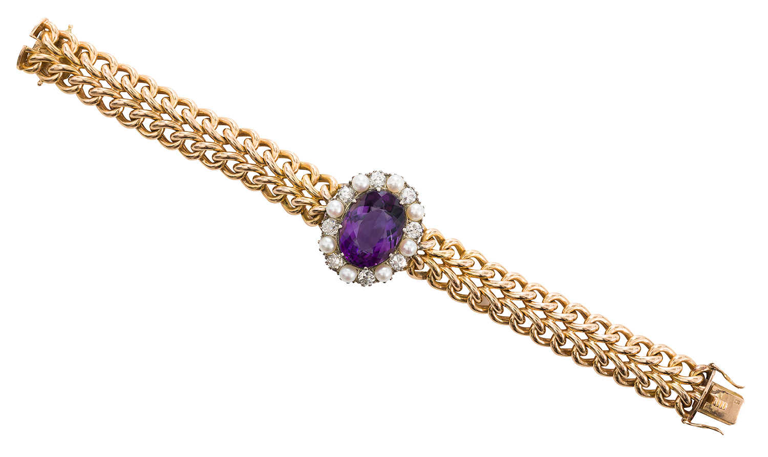 Featuring a central panel set with an oval cut amethyst of 11.55cts, surrounded by alternating cultured pearls and old European cut diamonds, set above a pierced herringbone link bracelet in 18ct rose gold, total length 175mm.