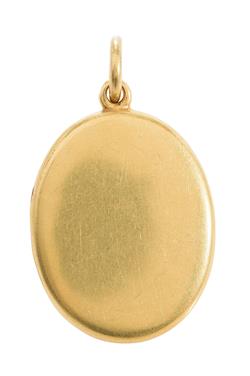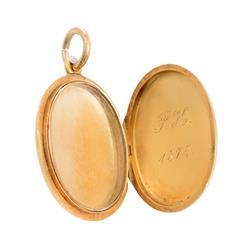 The hinged oval locket crafted in 15ct gold with polished finish. Engraved to the interior F.H. 1875.