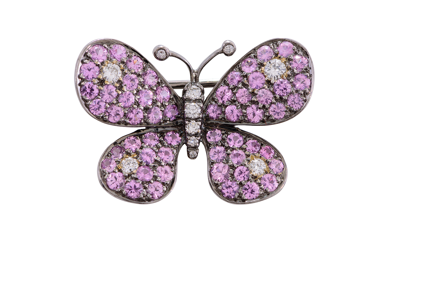 Each wing set with round pink sapphires in graduating hues and a single round brilliant cut diamond, having a diamond set body and antennae, total sapphire weight 1.91cts, total diamond weight 0.08cts, mounted in 18ct white gold.