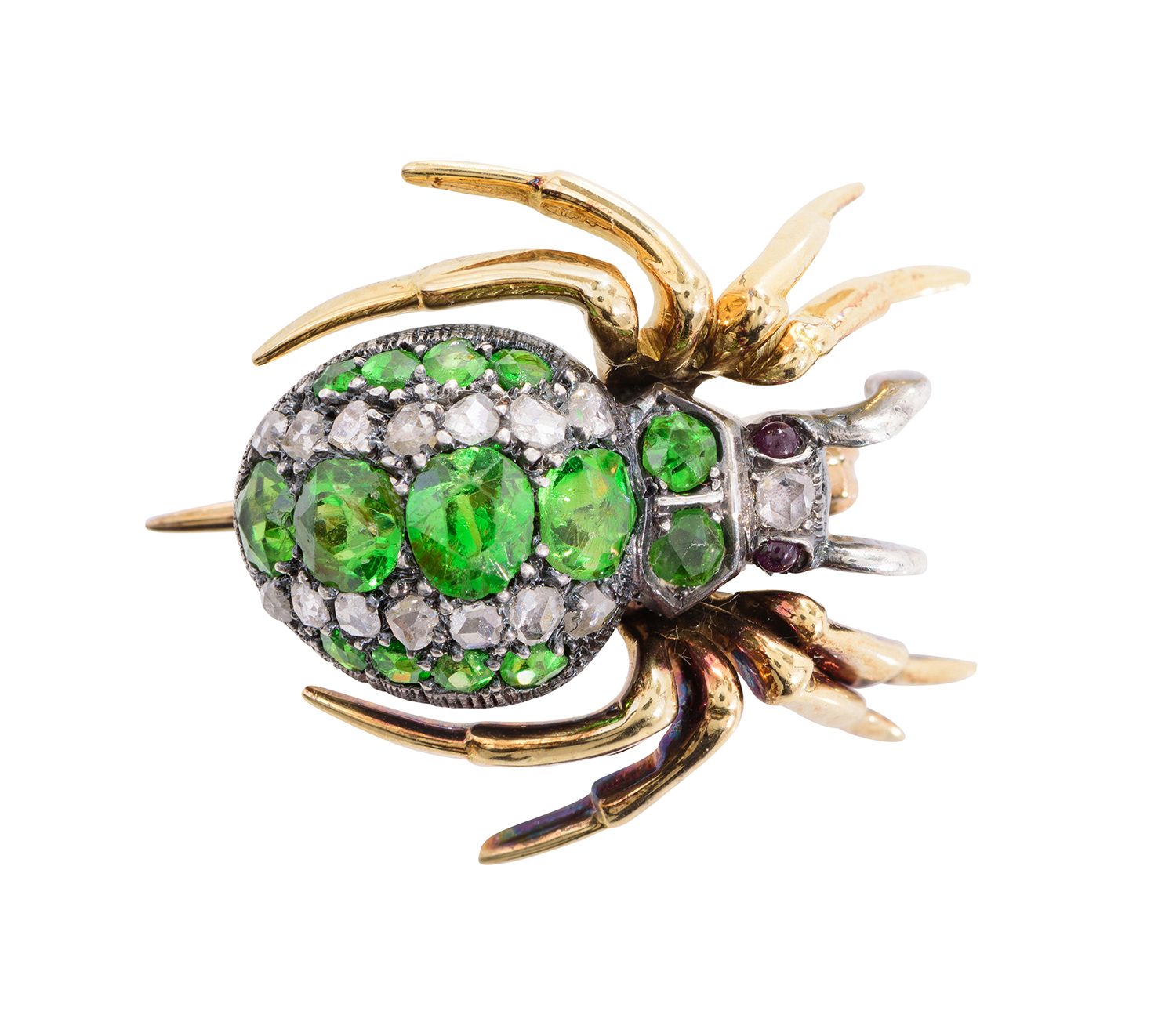 The body of the spider set with fourteen old cushion cut demantoid garnets, interspaced with old mine cut diamonds and having cabochon red garnet set eyes, all mounted in 15ct gold and silver.
