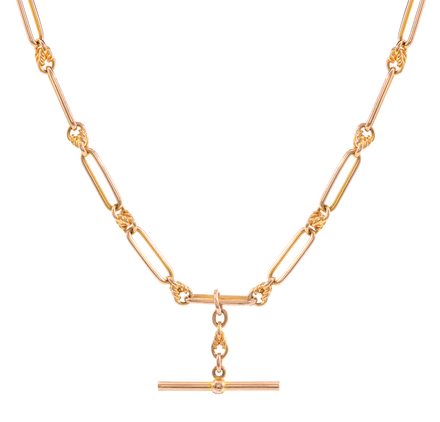 The fancy fetter link chain having a swivel clip and t-bar, all mounted in 9ct rose gold, total length 510mm.
