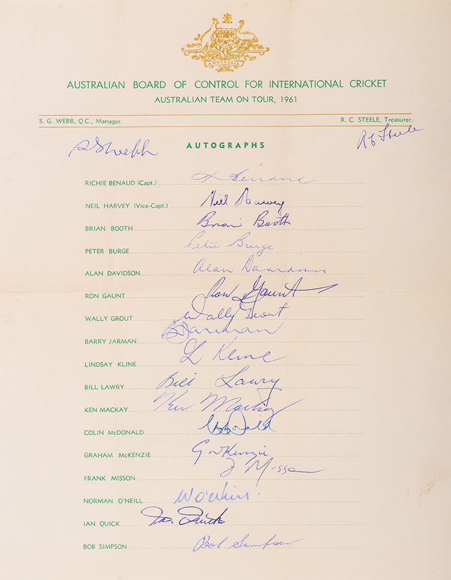 1961 AUSTRALIAN TEAM, OFFICIAL TEAM SHEET WITH 19 SIGNATURES INCLUDING RICHIE BENAUD, NEIL HARVEY & BILL LAWRY.