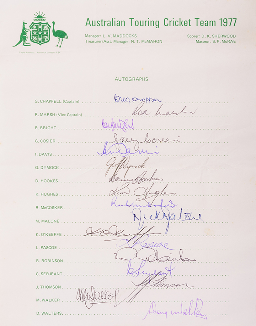 1977 AUSTRALIAN TEAM TO ENGLAND, OFFICIAL TEAM SHEET WITH 17 SIGNATURES INCLUDING GREG CHAPPELL, GARY COSIER & JEFF THOMSON.