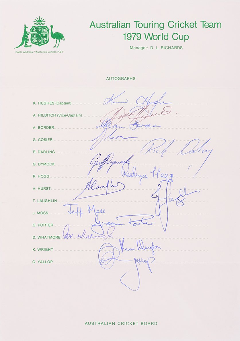 1979 AUSTRALIAN TEAM TO WORLD CUP, OFFICIAL TEAM SHEET WITH 14 SIGNATURES INCLUDING KIM HUGHES, ALLAN BORDER & RODNEY HOGG.