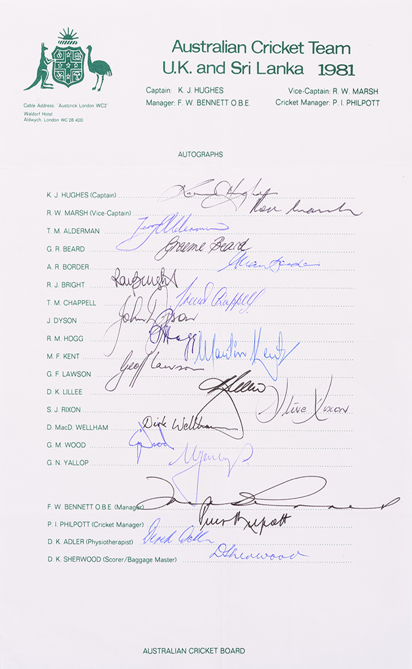 1981 AUSTRALIAN TEAM TO UK & SRI LANKA, OFFICIAL TEAM SHEET WITH 20 SIGNATURES INCLUDING KIM HUGHES, ALLAN BORDER & DENNIS LILLEE.