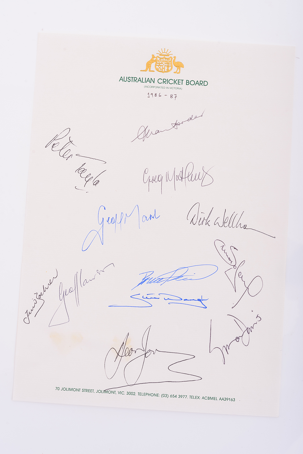 1986-87 AUSTRALIAN TEAM V ENGLAND & WEST INDIES, TEAM SHEET WITH 12 SIGNATURES INCLUDING ALLAN BORDER, STEVE WAUGH & DEAN JONES.