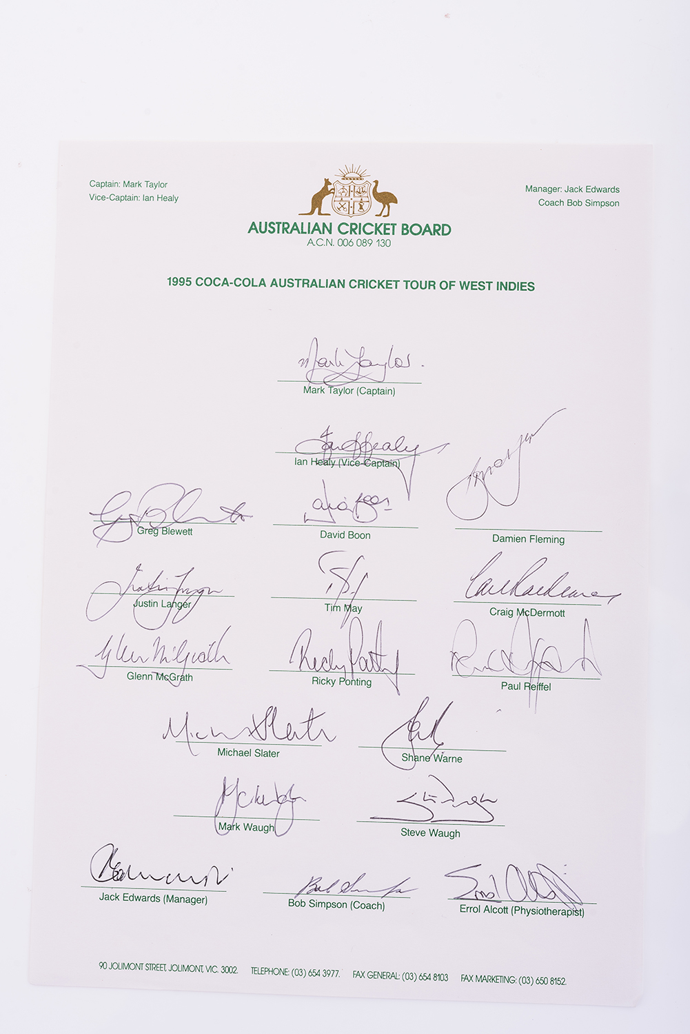 1995 AUSTRALIAN TEAM TO WEST INDIES, OFFICIAL TEAM SHEET WITH 18 SIGNATURES INCLUDING MARK TAYLOR, GLENN McGRATH & SHANE WARNE.