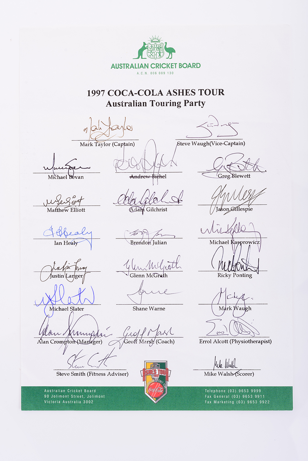 1997 AUSTRALIAN TEAM FOR ASHES TOUR, OFFICIAL TEAM SHEET WITH 22 SIGNATURES INCLUDING MARK TAYLOR, STEVE WAUGH & ADAM GILCHRIST.