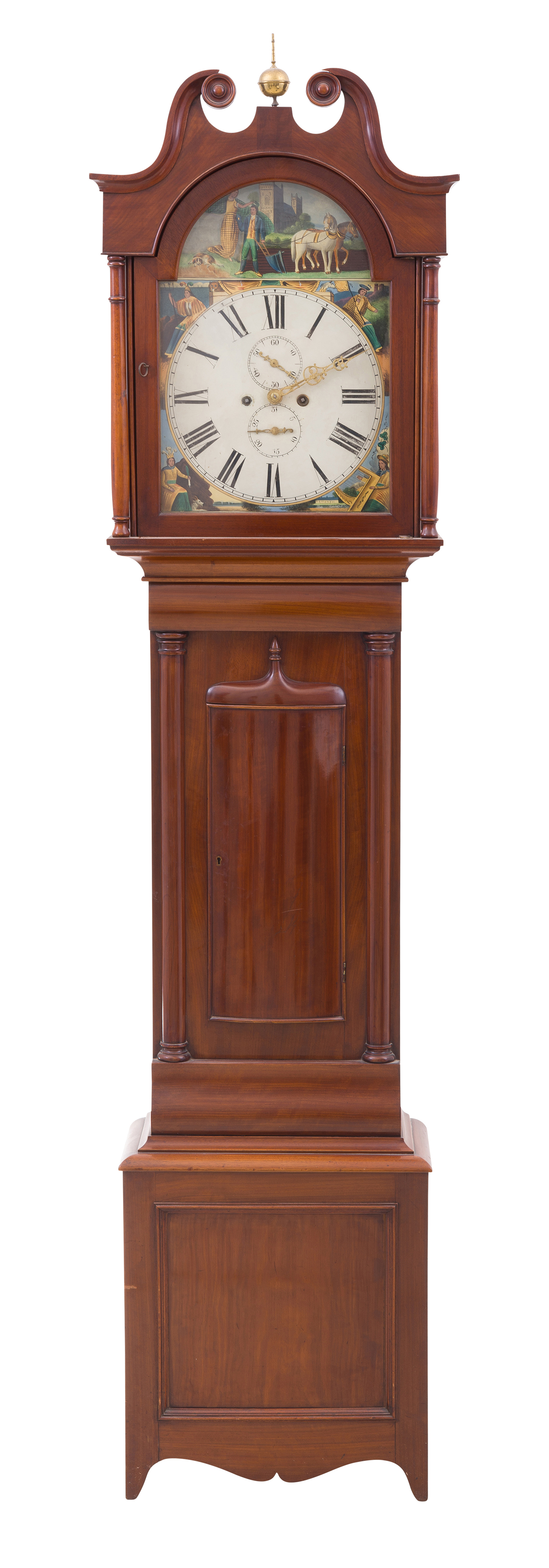 Having a painted dial with Roman numerals, seconds and date subsidiary chapters, all in an arched hood with swan neck pediment, above the panelled door enclosing original pendulum and weights, 218cm x 55cm x 25cm.