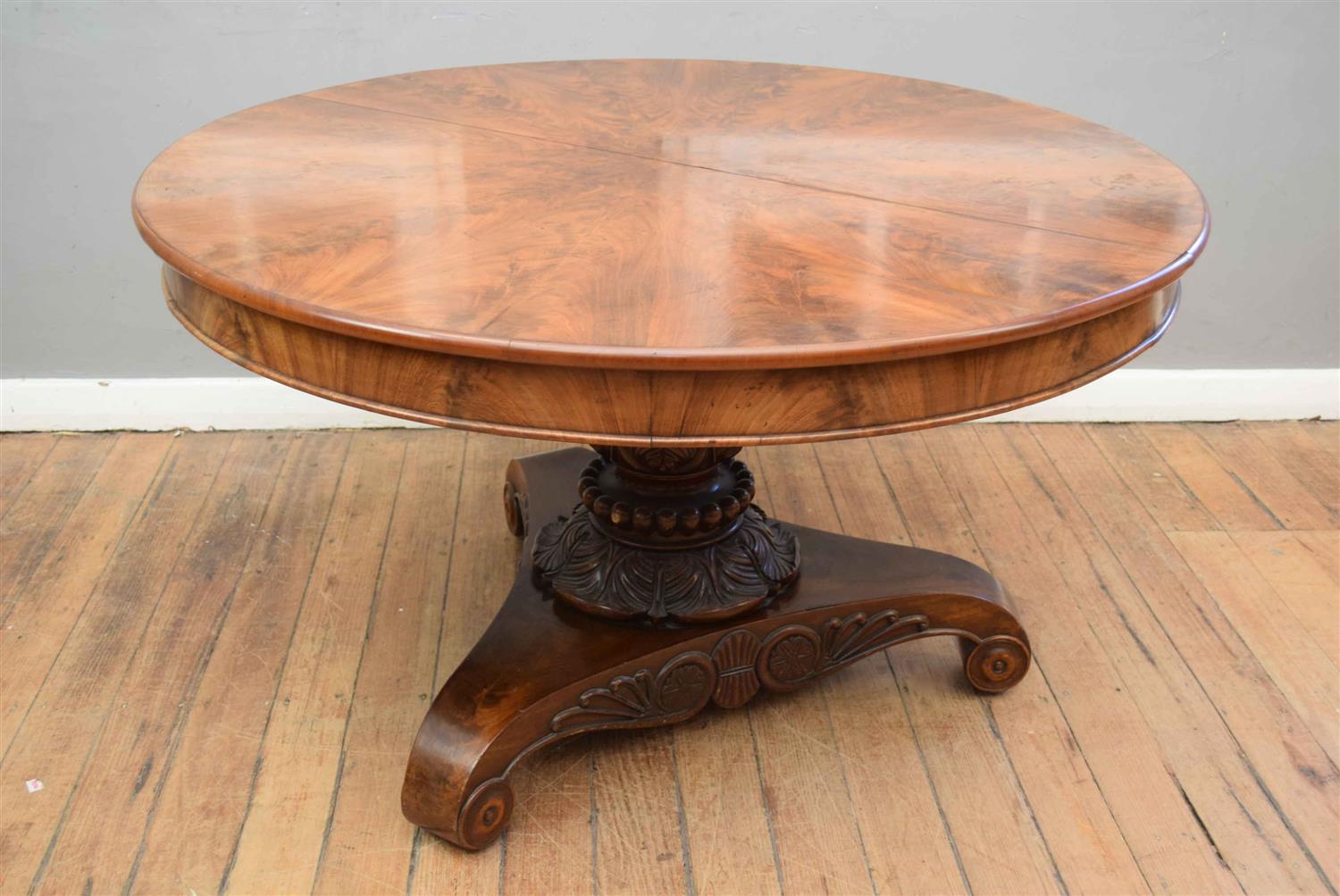 CIRCA 1830-The segemented marquetry flip top , with a crossbanded apron raised on a carved leaf tip stem above a tripartite base terminating in scroll feet, 73cm x 130cm diameter.