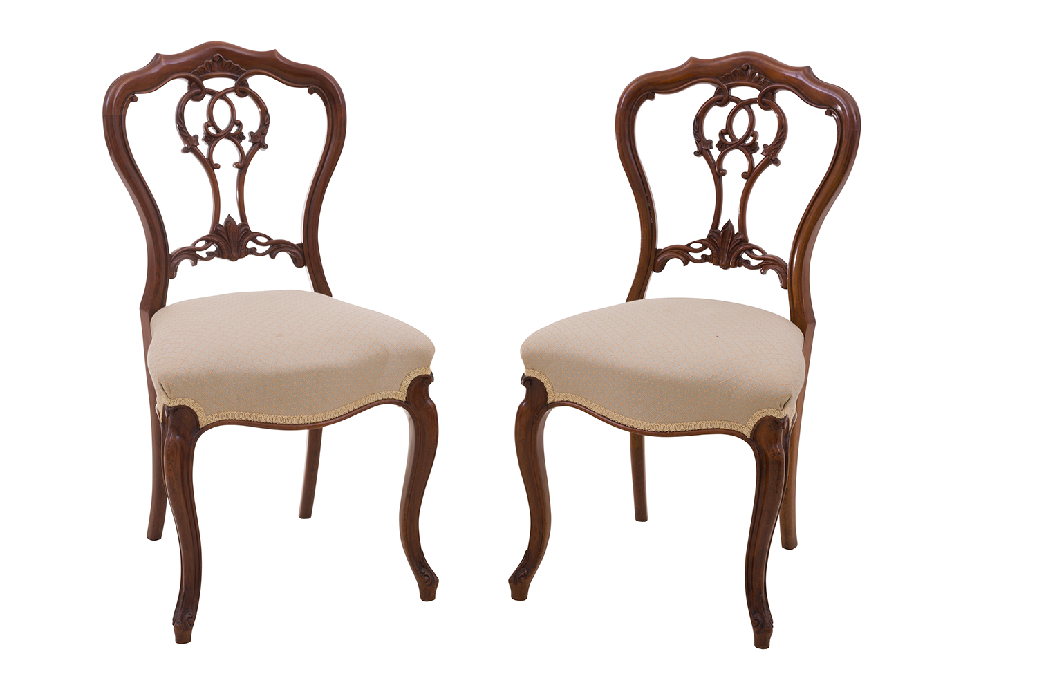 Each chair with an elaborately carved back, raised on cabriole legs, 90cm x 43cm x 42cm.