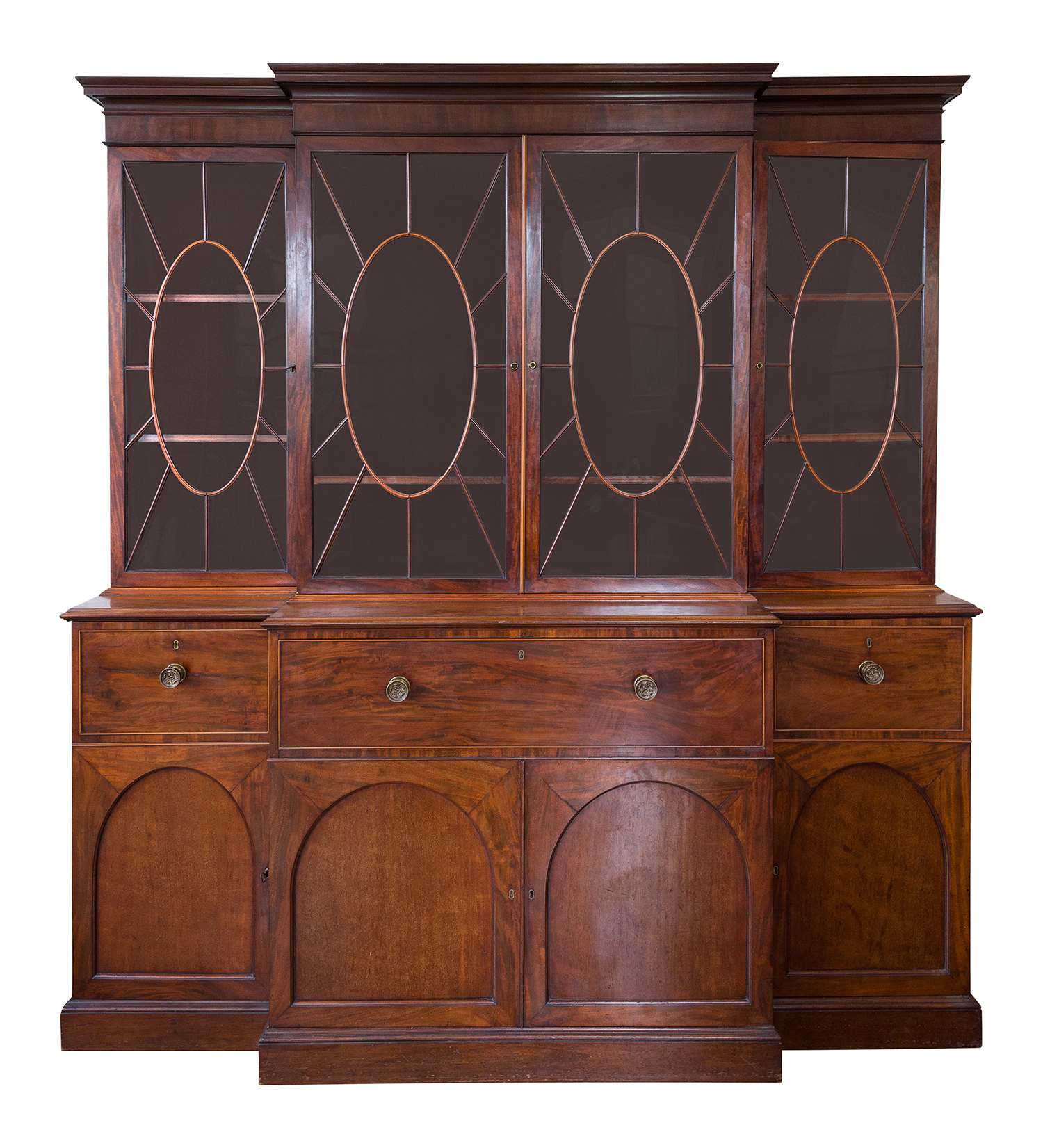 The upper body with four glazed doors, above a central fall front fitted drawer and four panelled doors, all raised on a pedestal base, stamped W. PRIEST 17 & 24 WATER ST BLACKFRIARS, 240cm high x 222cm wide x 61cm deep.