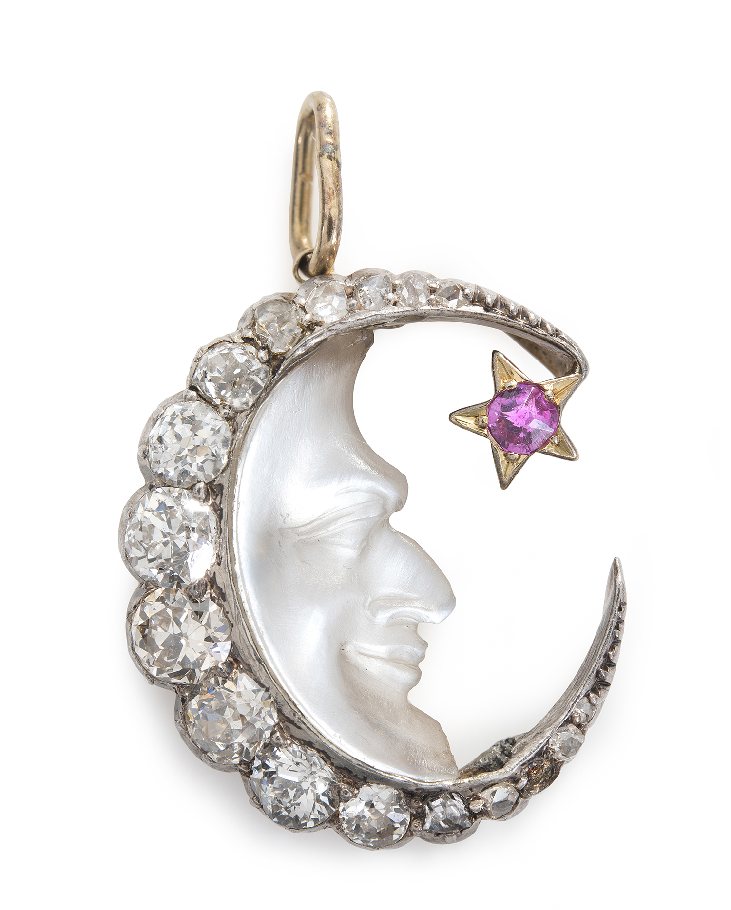 Styled as 'The man in the moon', set with a carved moonstone face, to an old European cut diamond set crescent moon and a ruby set star, mounted in 15ct gold and silver.