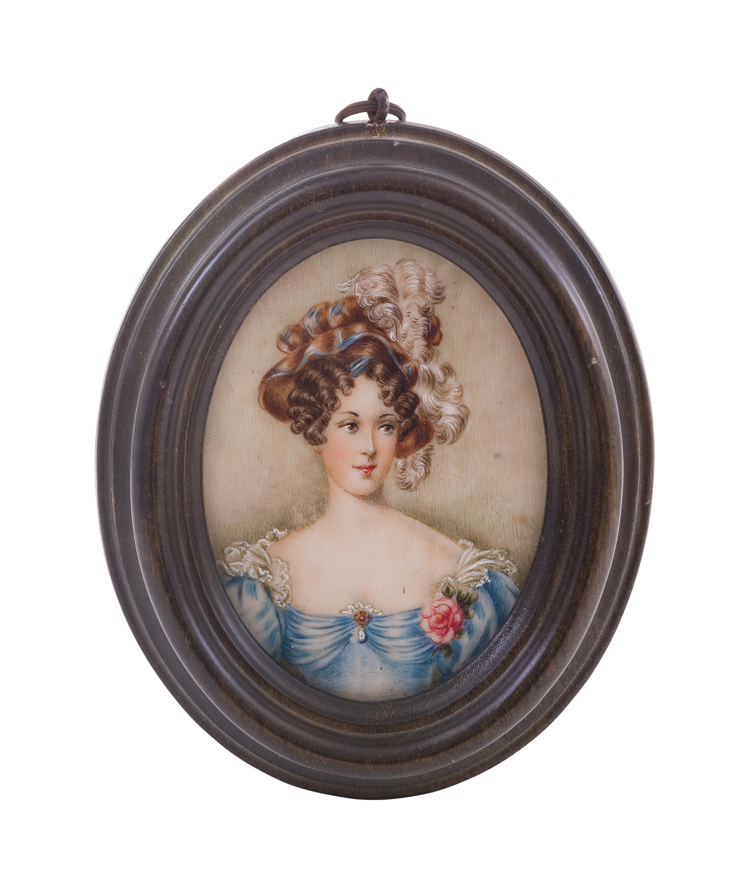 Depicting a young female wearing a feathered bonnet and a blue gown, set within a later turned wood frame, the miniature 7.5cm x 6cm. The frame 12cm x 10cm.