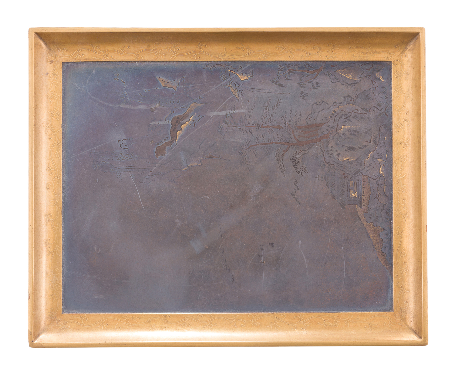 Rectangular in form, with a gilded border enclosing a central landscape scene on a matt ground, the reverse decorated in Nashiji, 1.5cm x 15cm x 19cm.