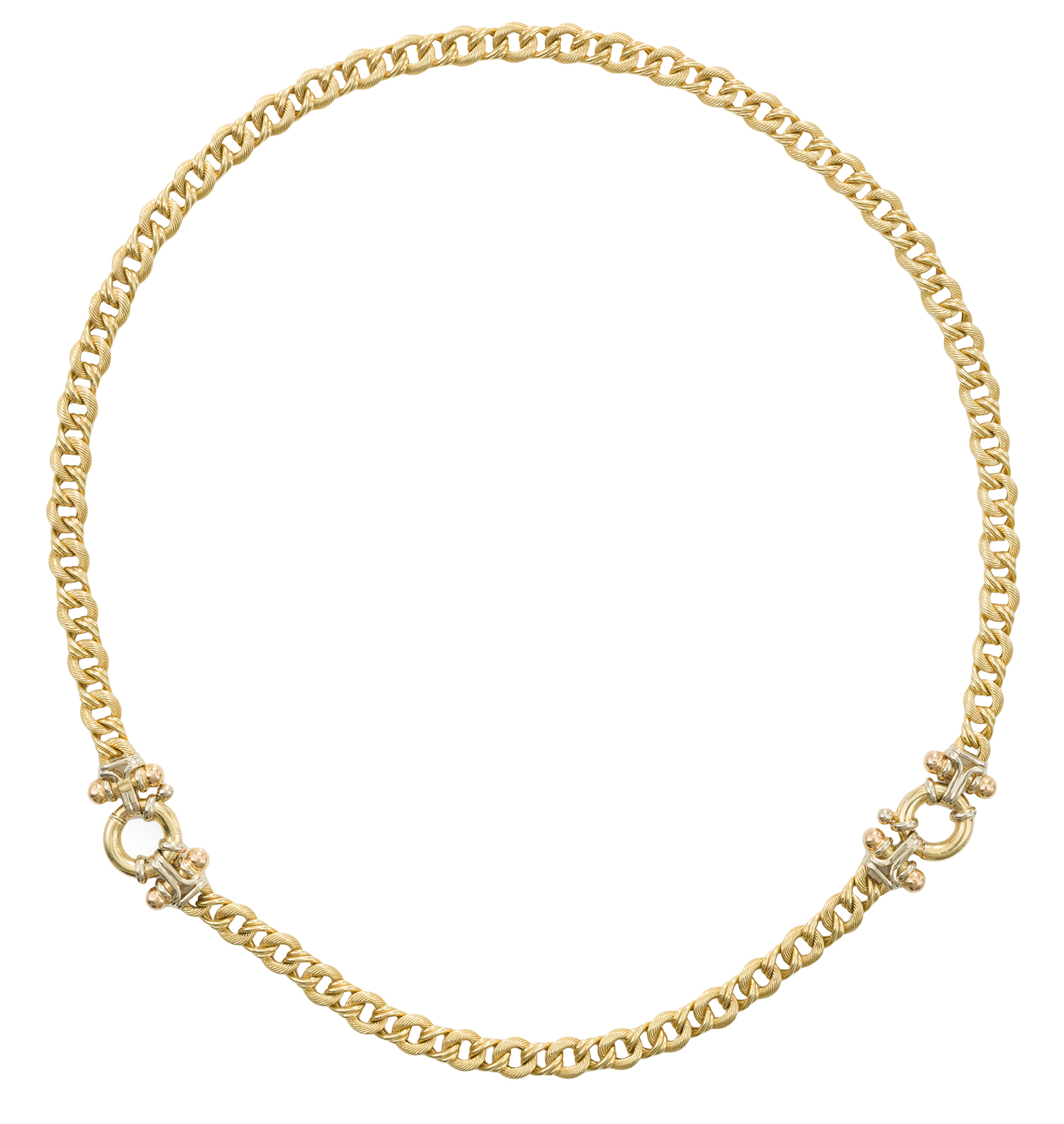 The necklace comprising fancy curb links, bolt ring clasp, total length 440mm, with a bracelet of conforming design, total length 190mm, crafted in 18ct gold.