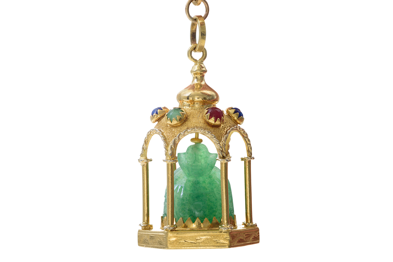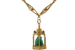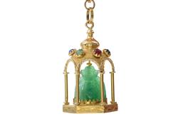 Featuring a carved jadeite buddha within a multi-gem set temple, suspended from a fancy link bracelet, all crafted in 18ct gold, total length 210mm.
