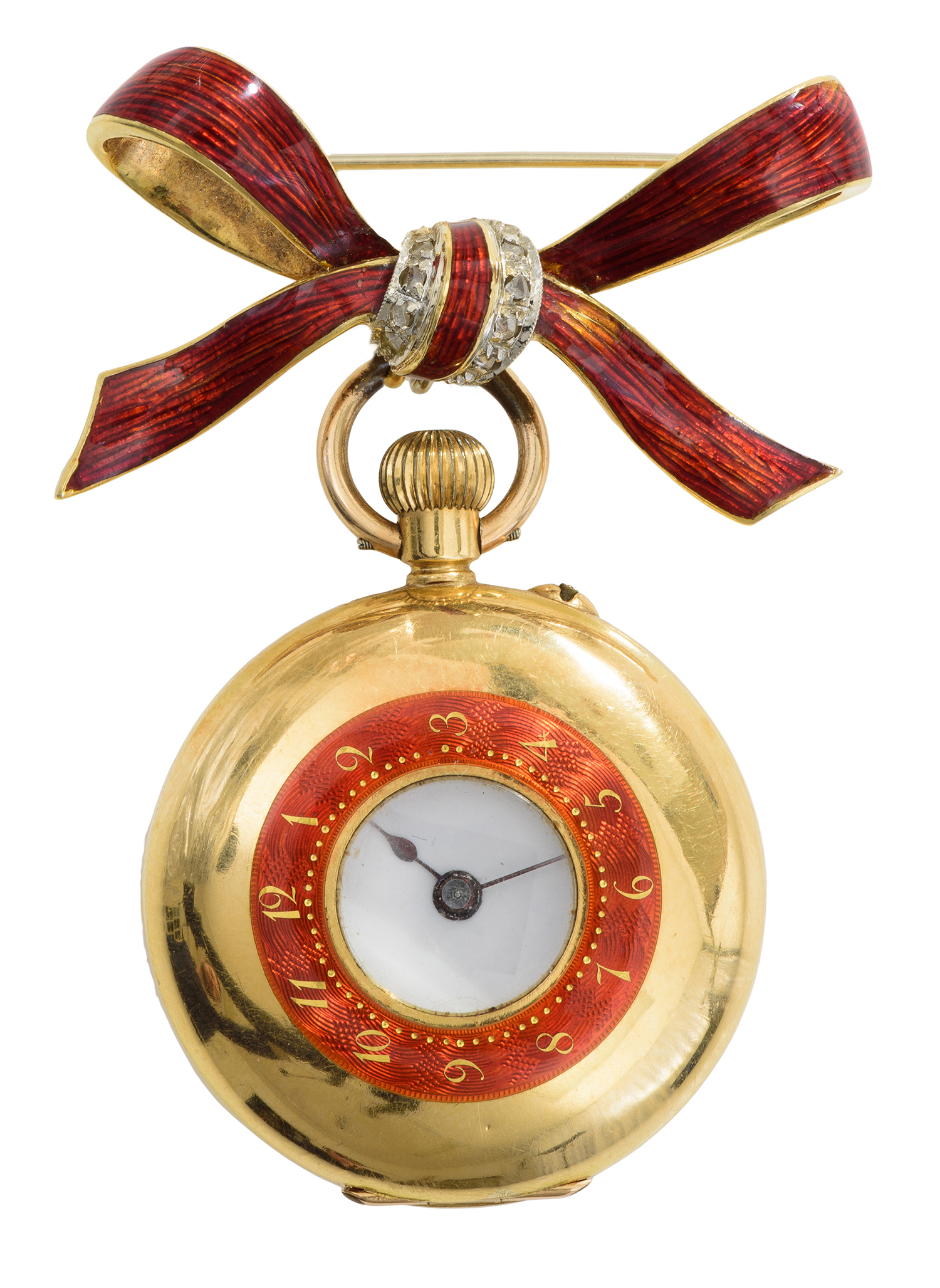 Manual wind movement, circular white dial with black Arabic numerals, 18ct gold case with enamelled outer dial, suspended from a detachable enamel and diamond bow brooch.