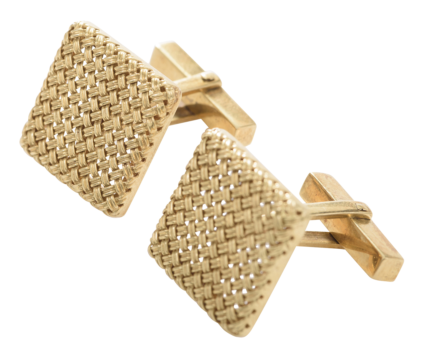 The square plaques of woven, textured gold, to flip-back fittings, crafted in 18ct gold.