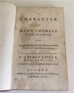 [Charles II]: SAVILE, George, Marquis of Halifax. A CHARACTER OF KING CHARLES THE SECOND. Contemporary calf, gilt, gilt-lettered morocco title-label. Sir William Beauchamp Proctor's copy, with his bookplate. Printed for J. & R. Tonson and S. Draper, 1750.