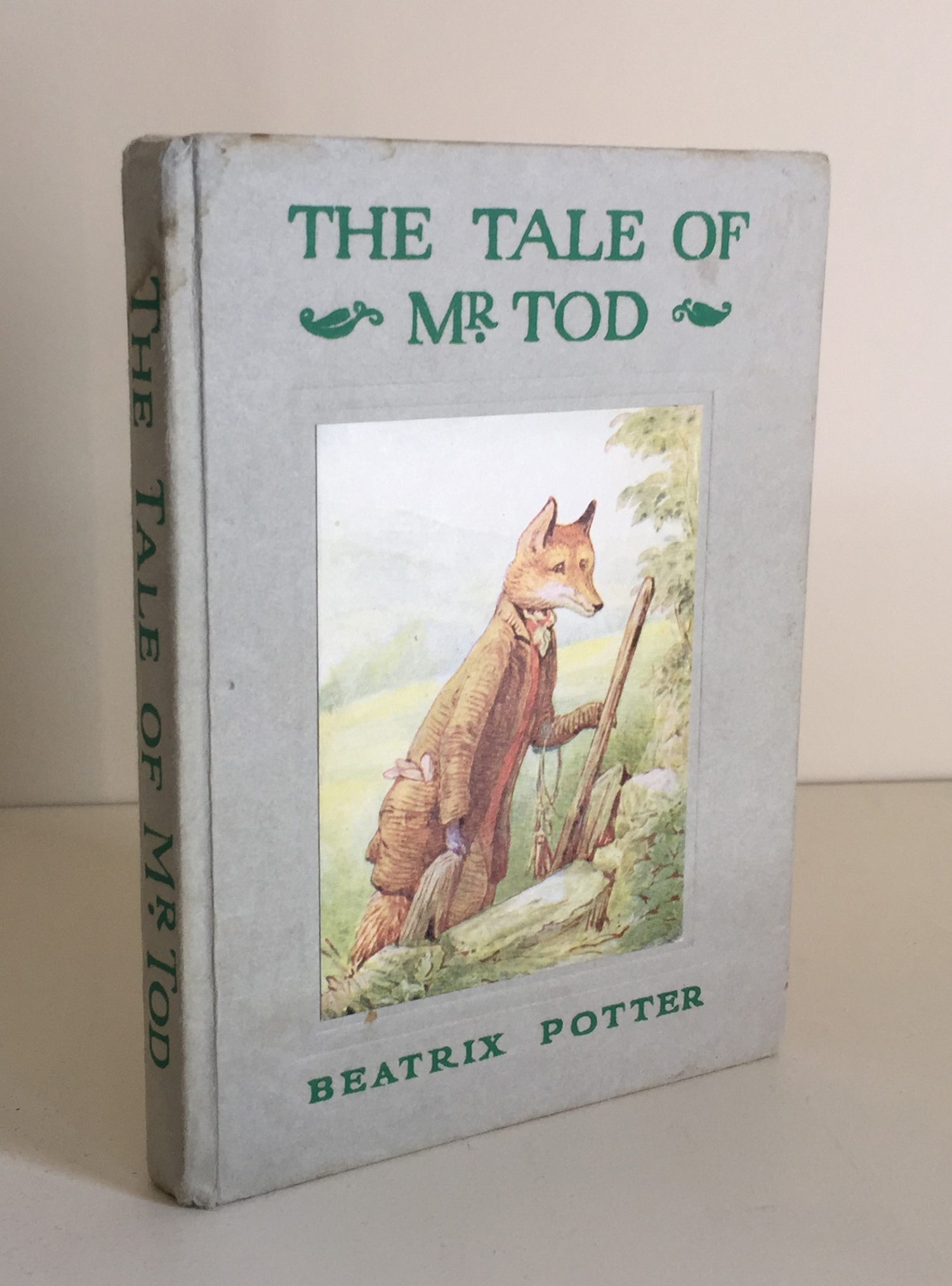 POTTER, Beatrix: An early edition of Potter's: THE TALE OF MR. TOD. demy 16mo; light grey papered boards, spine and upper board lettered & decorated in green, rectangular coloured illustration tipped to upper board, within a rectangular panel in blind. Frederick Warne, n.d. (See Quinby 21.)