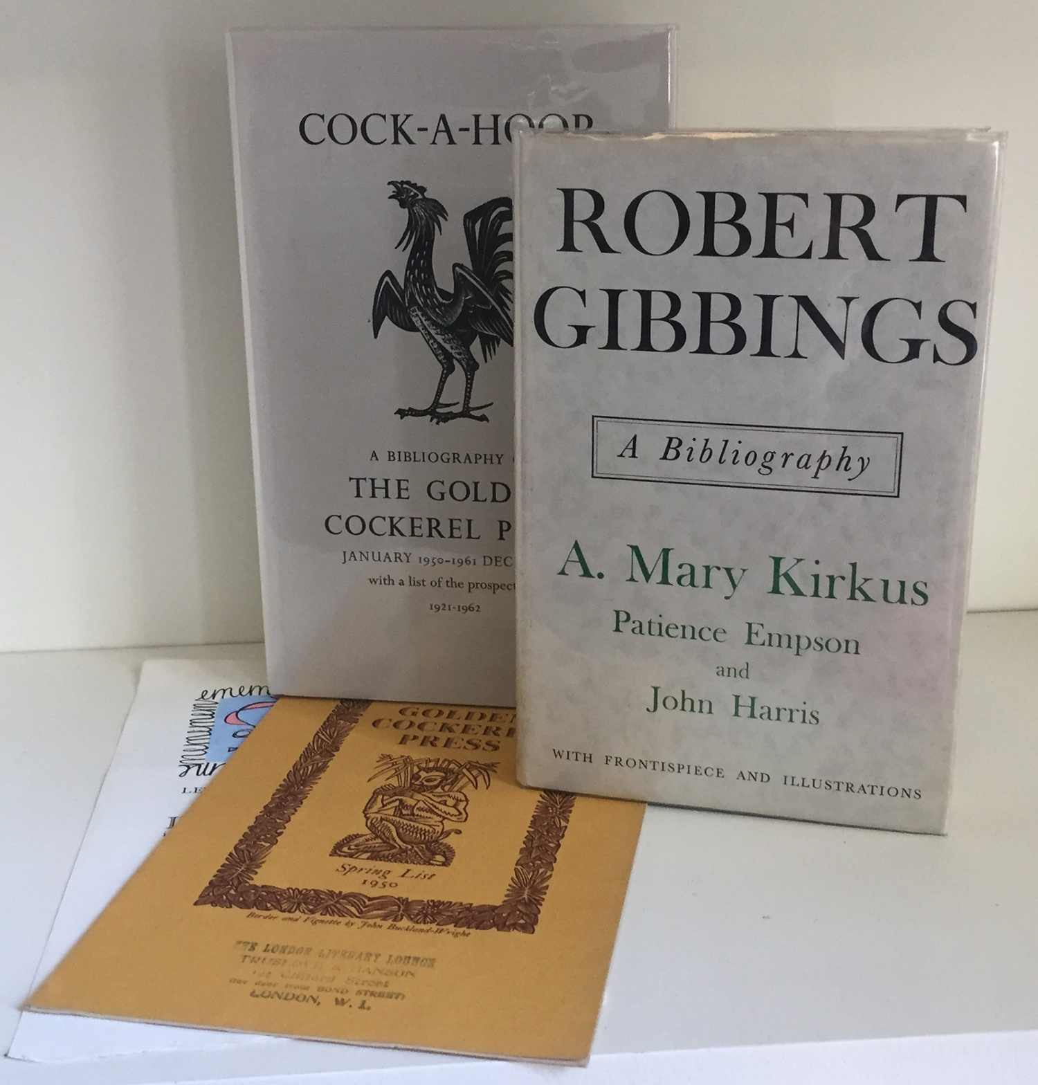 GOLDEN COCKEREL PRESS: CHAMBERS, David & Christopher Sandford (Compilers). COCK-A-HOOP. Private Libraries Association for the Golden Cockerel Press, [1976]. First edition. (Cock-a-Hoop 214.) + KIRKUS, Mary. ROBERT GIBBINGS: A BIBLIOGRAPHY. J. M. Dent & Sons, 1962. First edition, limited to 975 copies. + Two items of Golden Cockerel Press ephemera.