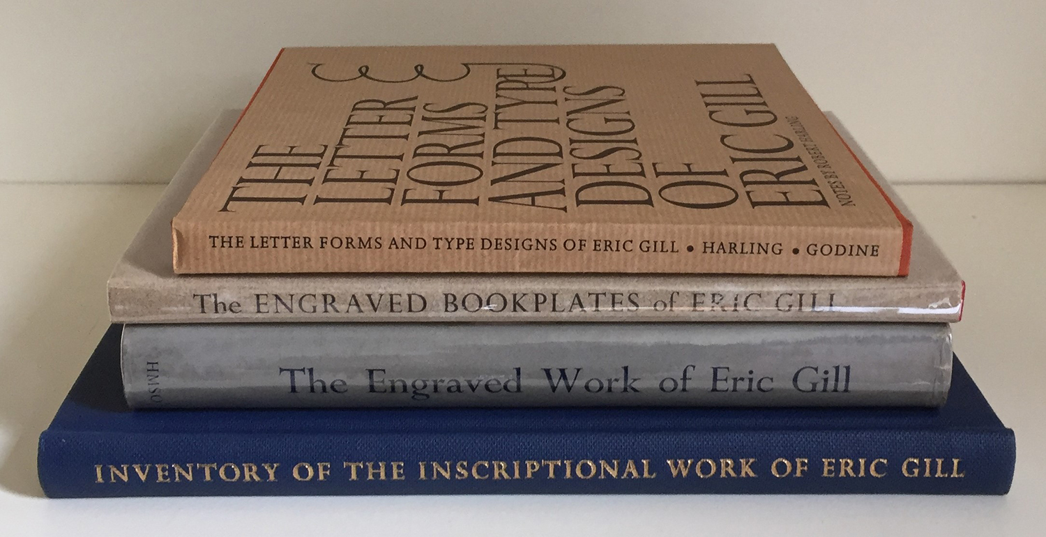 [GILL, Eric]: Four books about Eric Gill and his art, including: THE ENGRAVED BOOKPLATES OF ERIC GILL 1908-1940. Book Club of California, 1986. Ltd edition of 600 copies. + THE INSCRIPTIONAL WORK OF ERIC GILL. Cassell & Co., 1964. First edition. + THE LETTER FORMS AND TYPE DESIGNS OF ERIC GILL. Eva Svensson & David R. Godine, 1978.