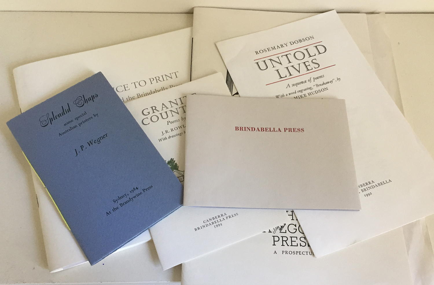 [BRINDABELLA & WAYZGOOSE PRESS]: Four items of ephemera printed by, or relating to, the Brindabella Press, including: BRINDABELLA PRESS. Wrappers. 1992. [Limited edition of about 400 copies.] + A LICENCE TO PRINT. Wrappers. Friends of the National Library of Australia, 1993. First edition, limited to 1500 copies. + The first prospectus issued by the WAYZGOOSE PRESS (no. 65 of 100 copies). + Brandywine Press Keepsake 1984.