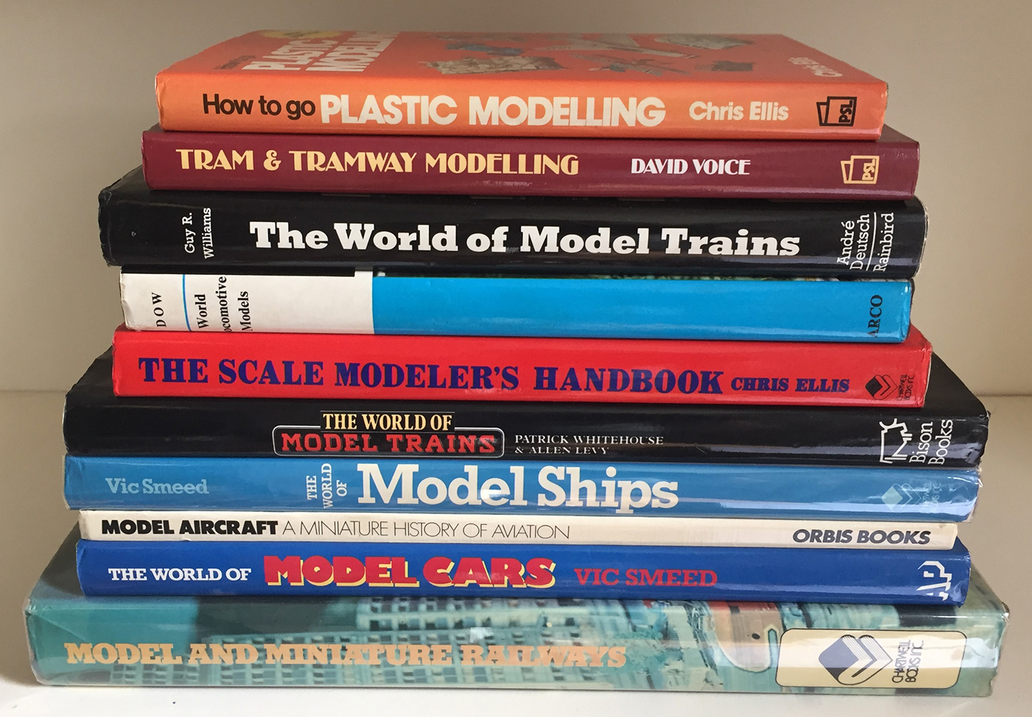 [SCALE MODELS]: A nice group of ten books about plastic modelling and scale model trains, trams, ships & cars, including: MODEL AND MINIATURE RAILWAYS. Chartwell Books, 1976. First U.S. edition. + THE WORLD OF MODEL TRAINS. Andre Deutsch, 1981. + HOW TO GO TRAM & TRAMWAY MODELLING. Patrick Stephens, 1982. First edition.