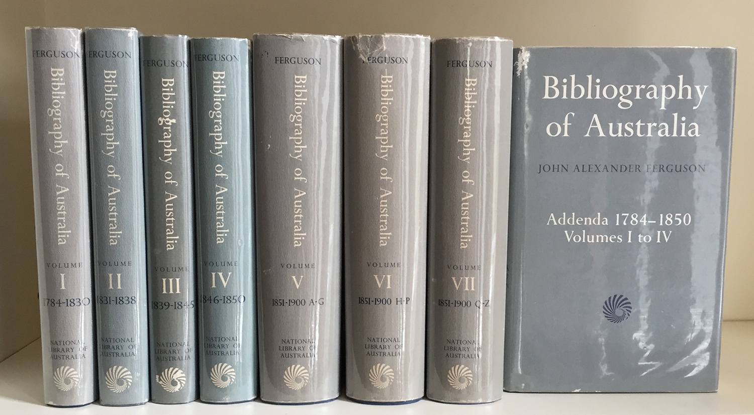 FERGUSON, John Alexander: BIBLIOGRAPHY OF AUSTRALIA. Vols. 1-7. National Library of Australia, 1977-1986. Facsimile edition. + ADDENDA 1784-1850 (Vols I-IV). National Library of Australia, 1986. First edition.