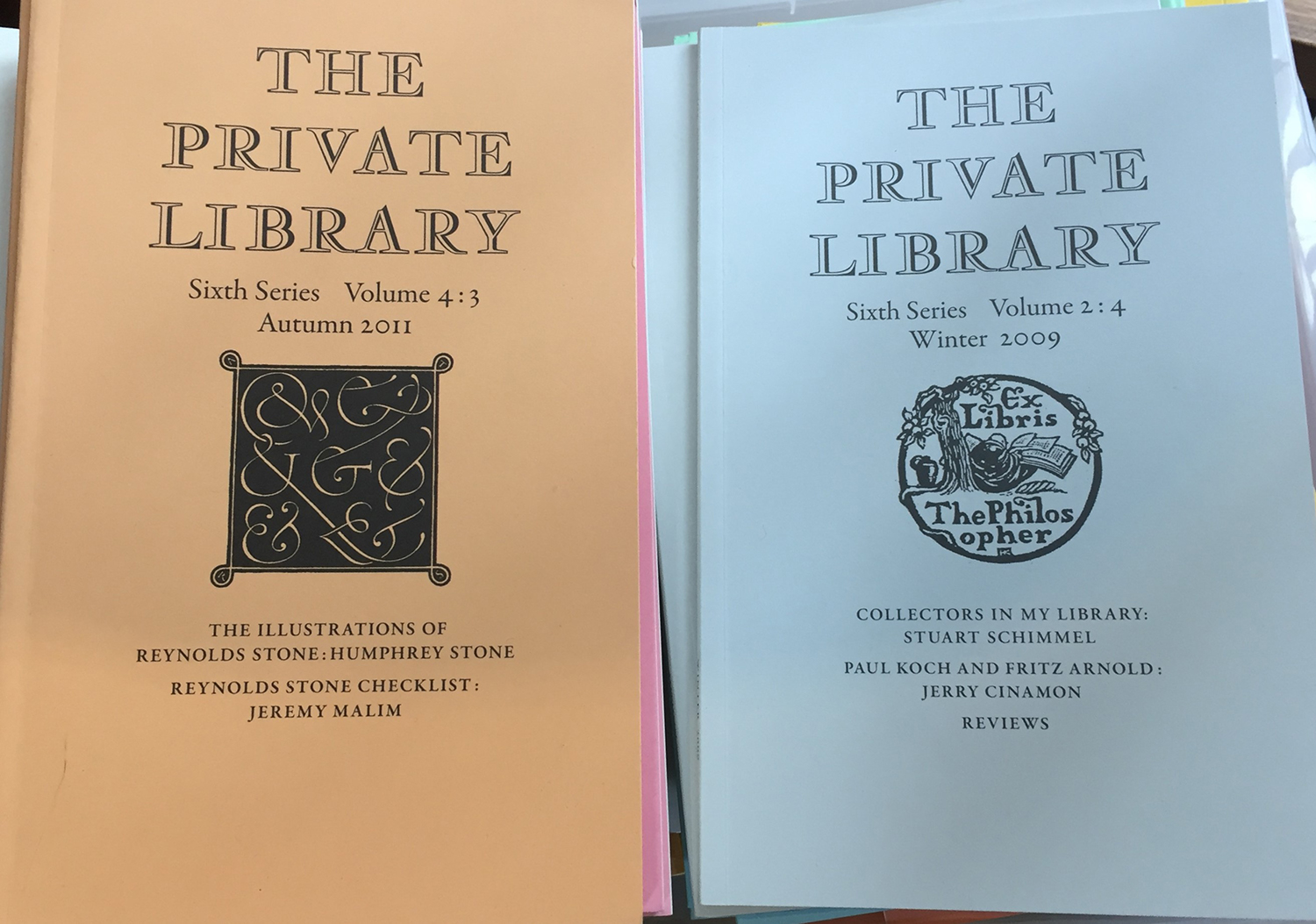 THE PRIVATE LIBRARY: A large number of volumes from this valued journal series, published by the Private Libraries Association (Series 1: Vol. 4: 1 & 7 1962 & 1963; Vol. 5: 1 - Vol. 8:4, 1964-67. Series 2: Vol. 1: 1 - Vol. 4:4, 1968-1971; Vol. 5:2 - Vol. 10:4, 1972-77. Series 3: Vol. 1:1 - Vol. 3:4, 1978-1980; Vol. 4:3, 1981; Vol. 5: 2 & 4, 1982; and Vol. 7: 1 & 3, 1984. Series 4: Vol. 1:1, 1988; Vol. 3:2, 1990; Vol. 7:3, 1994; Vol. 8:1, 1995; and Vol. 10:1-4, 1997. Series 5: Vol. 1:1 – Vol. 10:4, 1998-2007. Series 6: Vol. 1:1 - Vol. 3:4, 2008-2010; and Vol. 4: 2 & 3, 2011) + A quantity of related PLA ephemera.